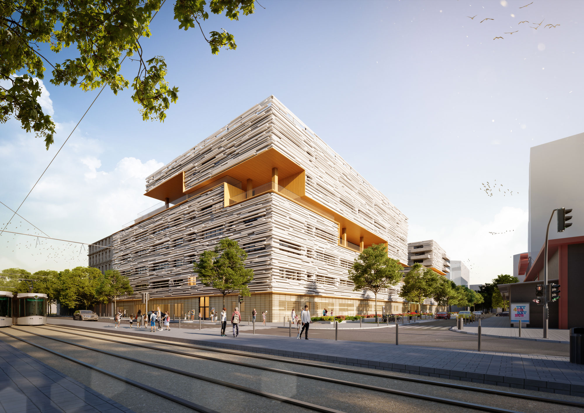 Les espaces dédiés à l’enseignement sont agréables à vivre, modulaires favorisant le croisement des connaissances et l’investissement de chacun. Les volumes bâtis sont conçus afin d’apporter un ensoleillement optimal même en cœur d’îlot, au travers d’un travail sur le rythme entre espaces vides et espaces pleins, ouverts et fermés. Véritable parc, le projet présente une surface importante en matière d’espaces extérieurs : cours, parvis, terrasses des galeries verticales, toiture accessible. Le fractionnement des volumes les uns sur les autres libèrent un maximum d’emprise et crée des interfaces privilégiées entre les différentes entités (école élémentaire, collège, lycée, pôles culturel et sportif) complètement autonomes. Véritable signal urbain, la peau des façades constituées de lames horizontales, s’entre-ouvre pour révéler les intérieurs aux passants et offrir de nouveaux horizons aux usagers. Les espaces intérieurs sont confortables, modulables et disposent d’un éclairage adapté, respectueux des cycles circadiens.