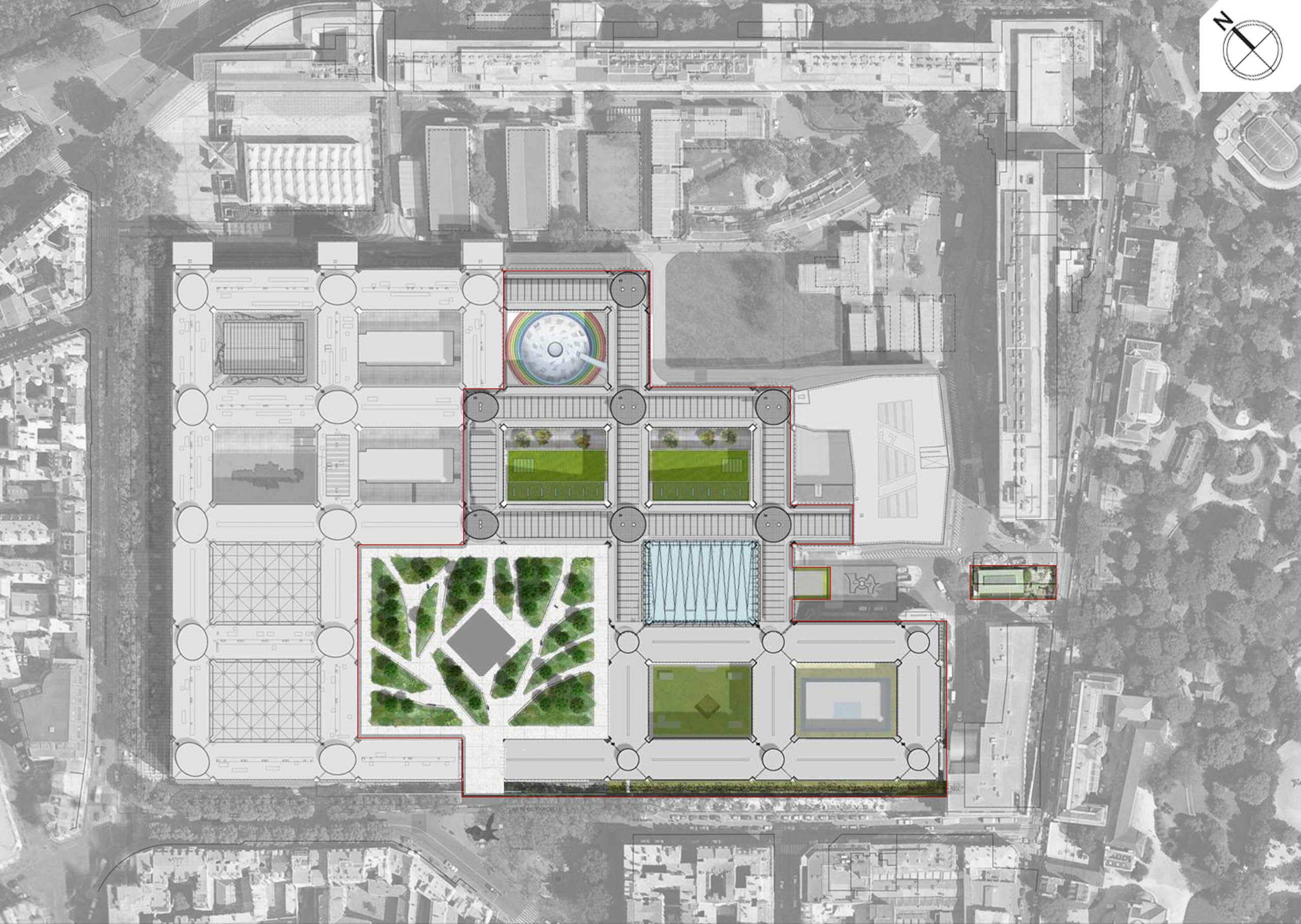 The openness to the city is strengthened by the creation of strong links with the district and the treatment of its surroundings, within the framework of global planning for the urban complex. The "hard" atmosphere of the campus has been softened by re-greening the site. A new, predominantly green, forecourt greets the public and serves as an interface with the city, offering unprecedented perspectives and full transparency on campus life.