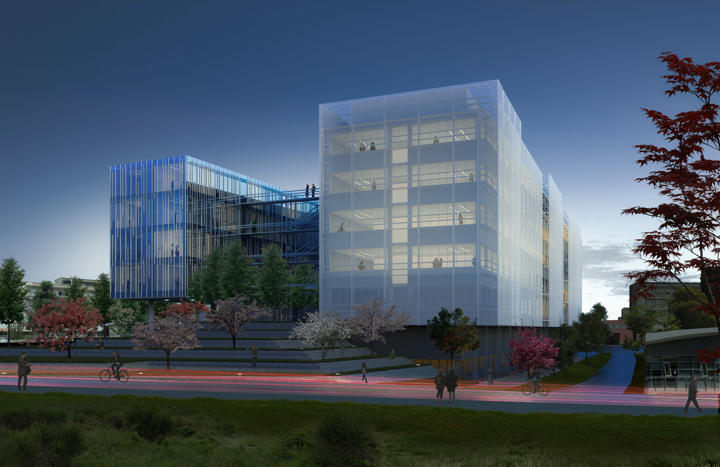 Le paysage global du bâtiment a été imaginé comme un créateur de biodiversités en offrant un continuum de plusieurs micro-paysages diversifiés : les prairies, le talus de la faille Ouest, les différentes poches d’arbres. Des espaces intermédiaires se succèdent favorisant la rencontre propice au bien-être et à la créativité. Les espaces d’accueil regroupés dans le socle résolvent l’accroche au sol du bâtiment et sa connexion avec le campus grâce à des accès hiérarchisés. Le bâtiment est conçu comme un modèle de sobriété énergétique où le besoin de lumière artificielle est peu ressenti. Dans le secteur des laboratoires, des puits de lumière aux dimensions généreuses sont notamment construits.