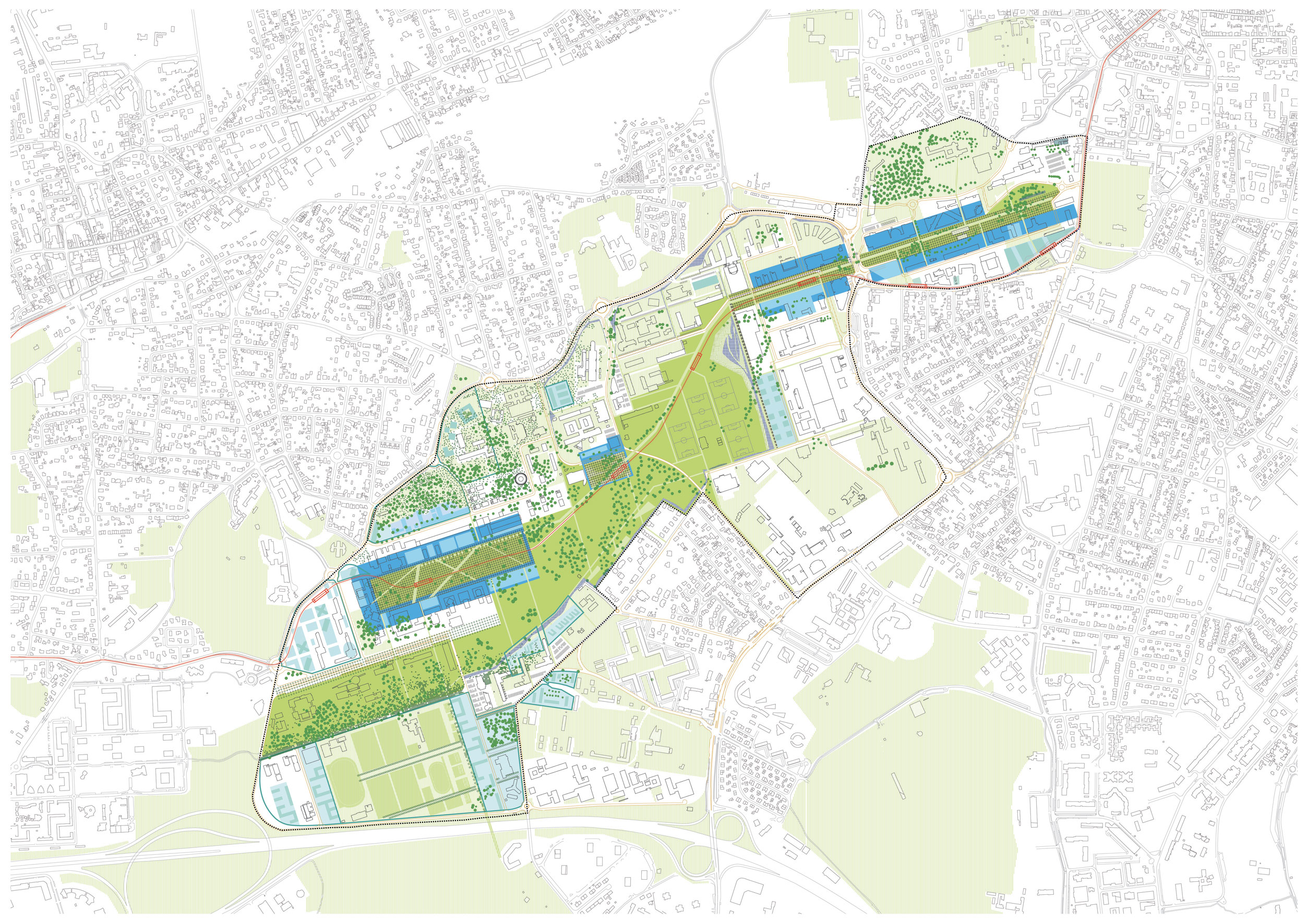 Cette répartition en trois entités donne une organisation très simple et très lisible au campus, chaque entité est identifiable par des architectures spécifiques. Elles sont d’ailleurs chacune organisée autour d’espaces extérieurs adaptés à l’usage. Cette implantation permet une compréhension intuitive de l’organisation du campus. Chaque entité est indentifiable dès l’entrée du campus.