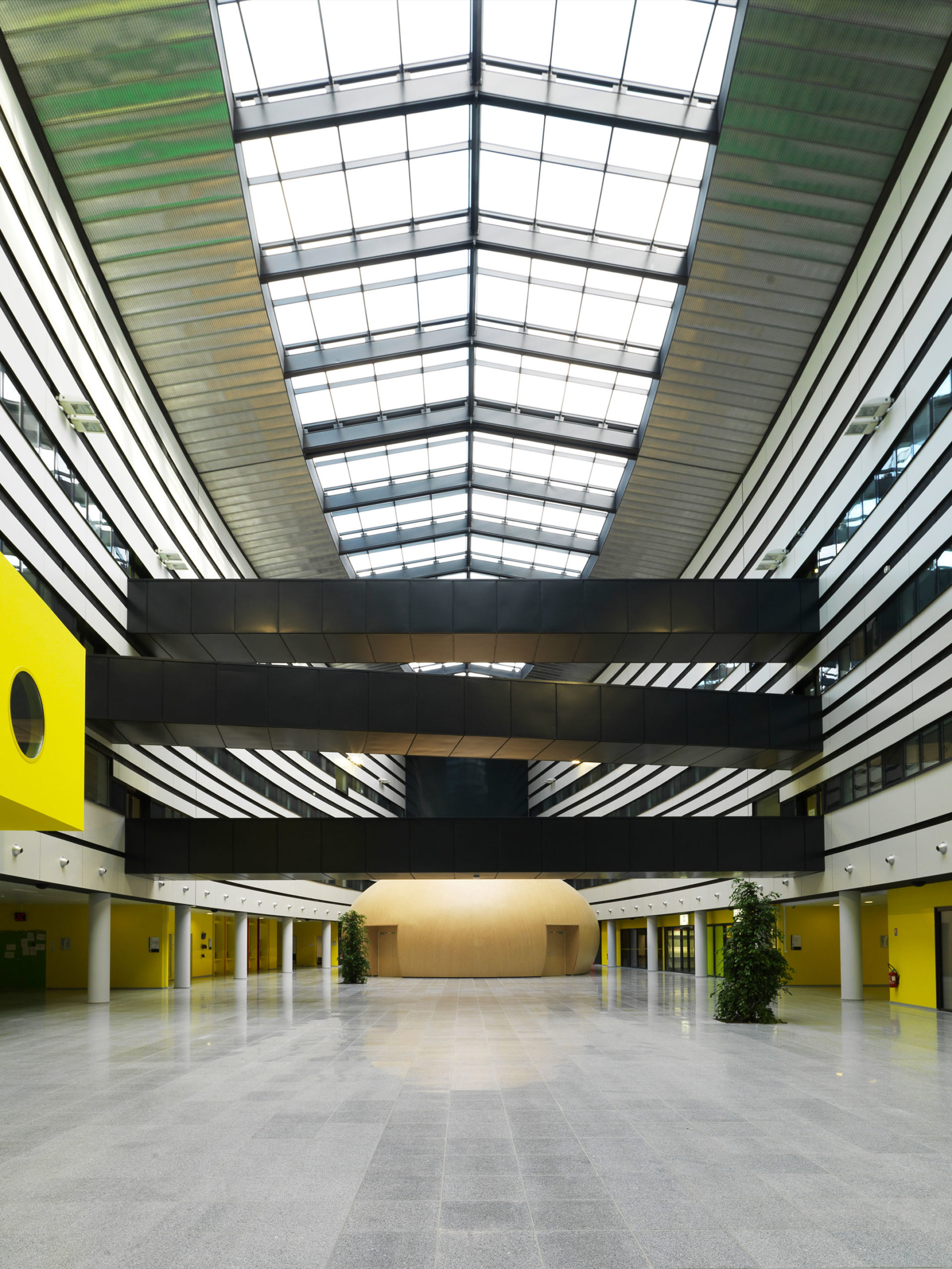 La fonctionnalité a été privilégiée en regroupant sur un même niveau l’ensemble de l’activité, d’une même discipline. Cette organisation transversale offre une nouvelle dynamique d’équipe et respecte la mission première de l’hôpital en introduisant dans le bâtiment le maximum de lieux conviviaux. Le pôle FMEH se démarque volontairement de l’aspect monolithique du CHU et possède une géométrie dynamique. L’organisation du nouveau bâtiment est dominée par la juxtaposition de deux ailes séparées par une faille végétale. L’ensemble de l’activité externe et le hall d’accueil sont regroupés sous une nef qui se distingue par sa forme fuselée et le profil adouci de sa toiture. Le porche monumental, creusé à la pointe de la nef, marque l’entrée de l’édifice, où les usagers pénètrent dans un vaste atrium baigné de lumière comprenant les salles de réception et d’admissions générales, relié au hall de la tour principale du CHU. L’aile d’hospitalisation se présente comme un ensemble homogène, éclairé par de larges patios végétalisés dispensant une lumière naturelle généreuse dans tous les étages. Le bâtiment possède deux écritures architecturales. La façade métallique de la nef centrale contribue à donner un caractère résolument moderne à l’édifice. Les façades en béton poli du bâtiment d’hospitalisation expriment par leur rigueur de mise en oeuvre la précision du processus médical.