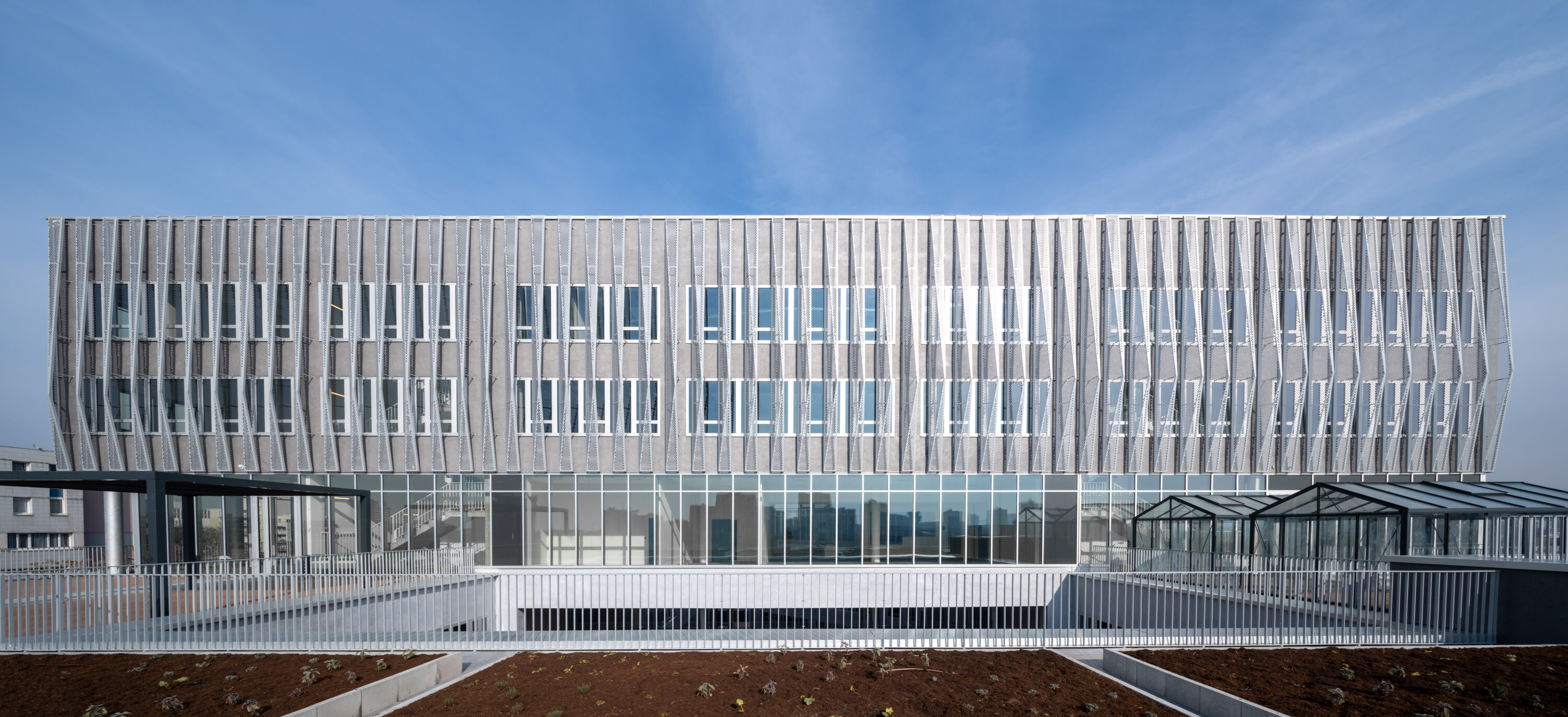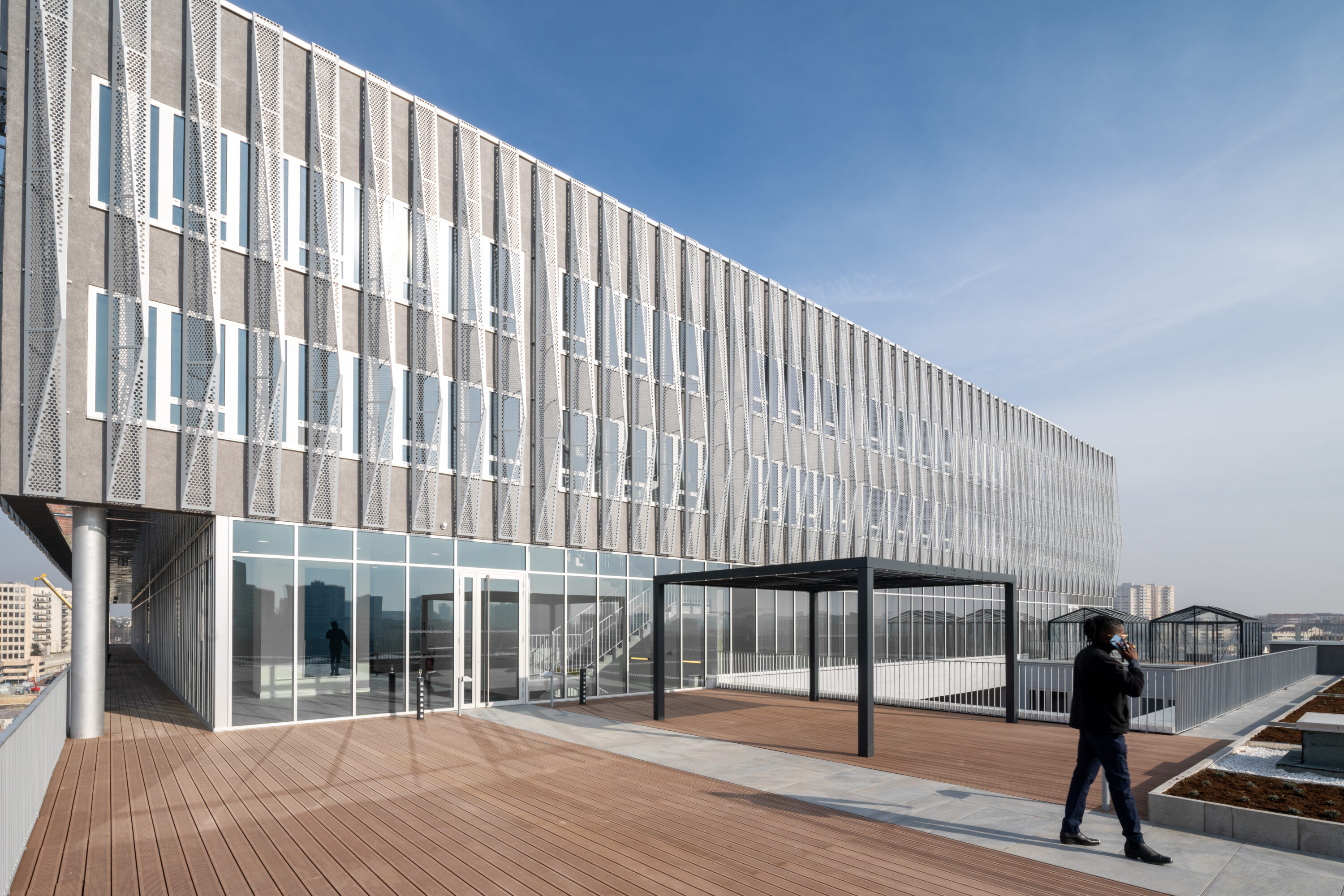 Le projet a pour but le regroupement de l’ensemble des services du Département du Val-De-Marne, jusqu’à présent répartis dans plusieurs lieux, dans un nouveau bâtiment tertiaire flexible et évolutif, agréable à vivre au quotidien. La trame optimale et fonctionnelle offre des espaces cloisonnés pouvant évoluer vers plus d’open-space. Son plan rationnel et créateur de liens valorise les nouveaux usages et les lieux de croisements et d’échanges notamment au moyen d’un potager partagé en prolongement de la grande terrasse associée au restaurant panoramique. La façade est traitée en double peau vibrante, dynamique et poétique, dans la finesse des lames métalliques qui ruissellent tout autour du bâtiment. Ce relief monochrome performant, est constituée de brises soleils pliés dont le mouvement, similaire à une onde, confère toute l’identité du bâtiment.