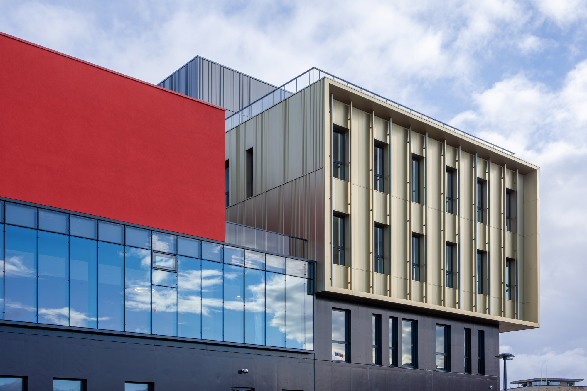 L’enveloppe polymorphe de l’édifice joue sur différents niveaux de transparence, qui laissent entrevoir les activités et l’animation intérieurs, et offre des vues généreuses vers l’extérieur paysager. Les fonctions hébergées dans l’édifice recherchent une trame rationnelle et fonctionnelle pour un programme conventionnel et des locaux banalisés. La structure poteaux-poutres permet une modularité dans le temps et une réversibilité des usages.