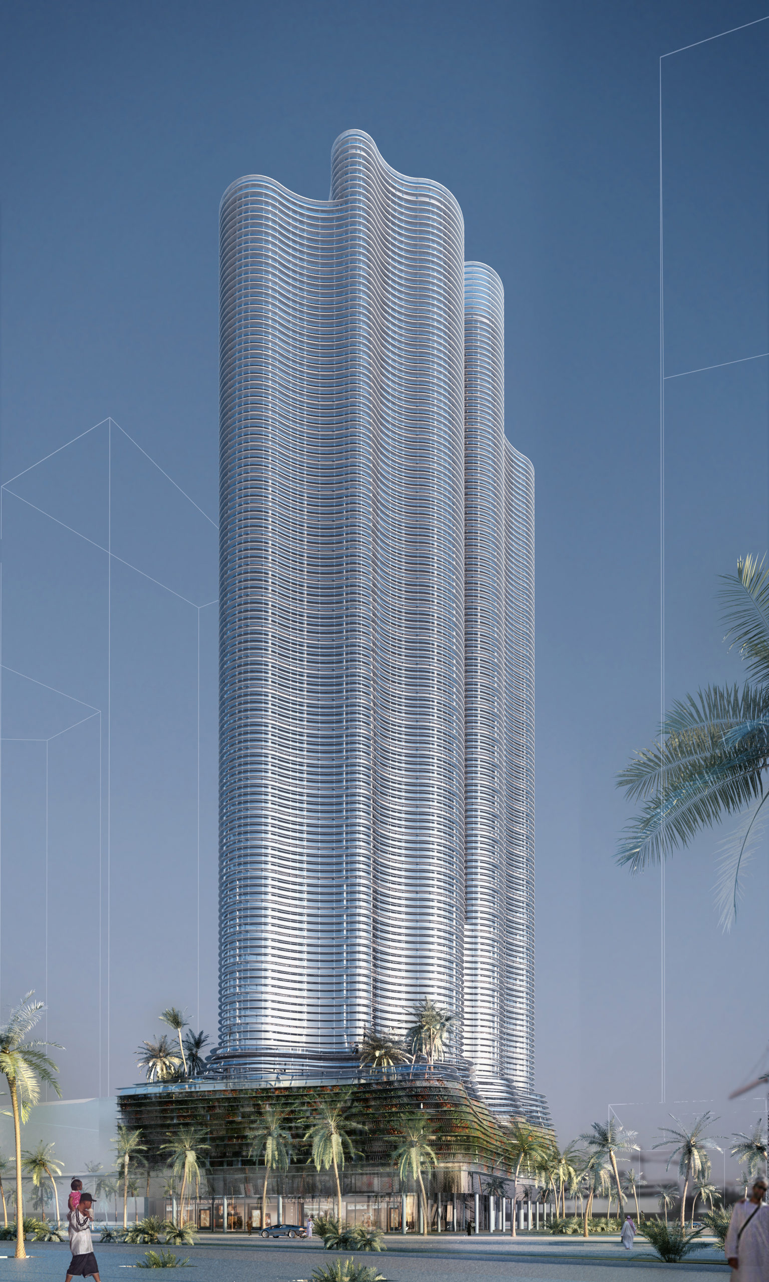 La tour s’insère dans une ville déjà reconnue pour ses icones architecturales défiant le ciel. Elle se découpe en deux volumes reliés entre eux par une batterie d’ascenseurs panoramiques. Chacun abritant un appartement par niveau, ils libèrent des surfaces d’habitation généreuses. Le projet se développe verticalement par une succession de courbes organiques, à l’intérieur desquelles les appartements s’érigent comme autant de villas baignées de lumière naturelle. L’organisation de chaque logement est fluide et modulable, adaptée au climat subtropical et aride de la ville. Sur le toit, des duplex pourvus de jardins-terrasses s’ouvrent sur des piscines recouvertes par des coupoles. Sur toute la hauteur de l’édifice, des brise-soleils horizontaux soulignent les courbes voluptueuses des tours et assurent une protection thermique et lumineuse.