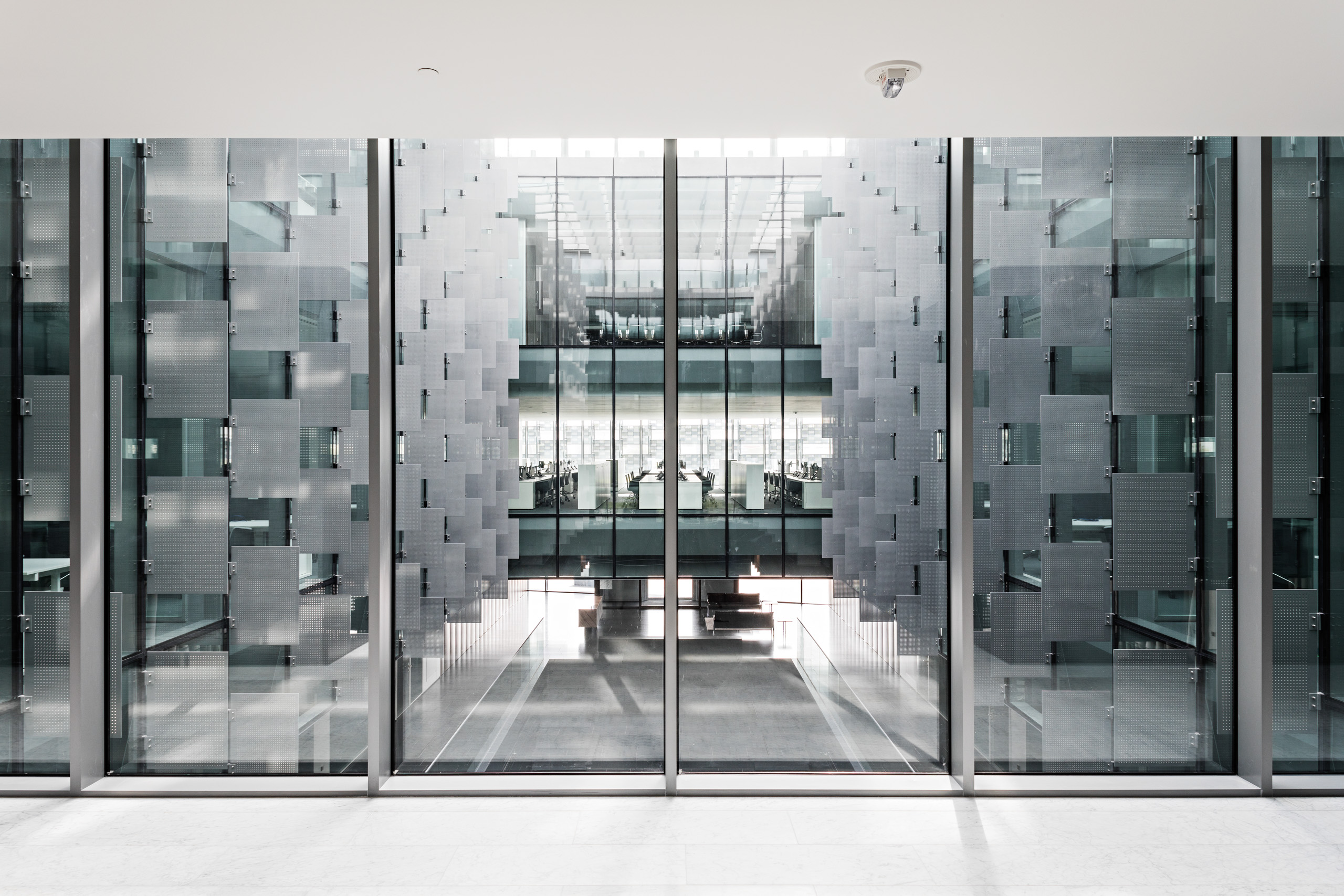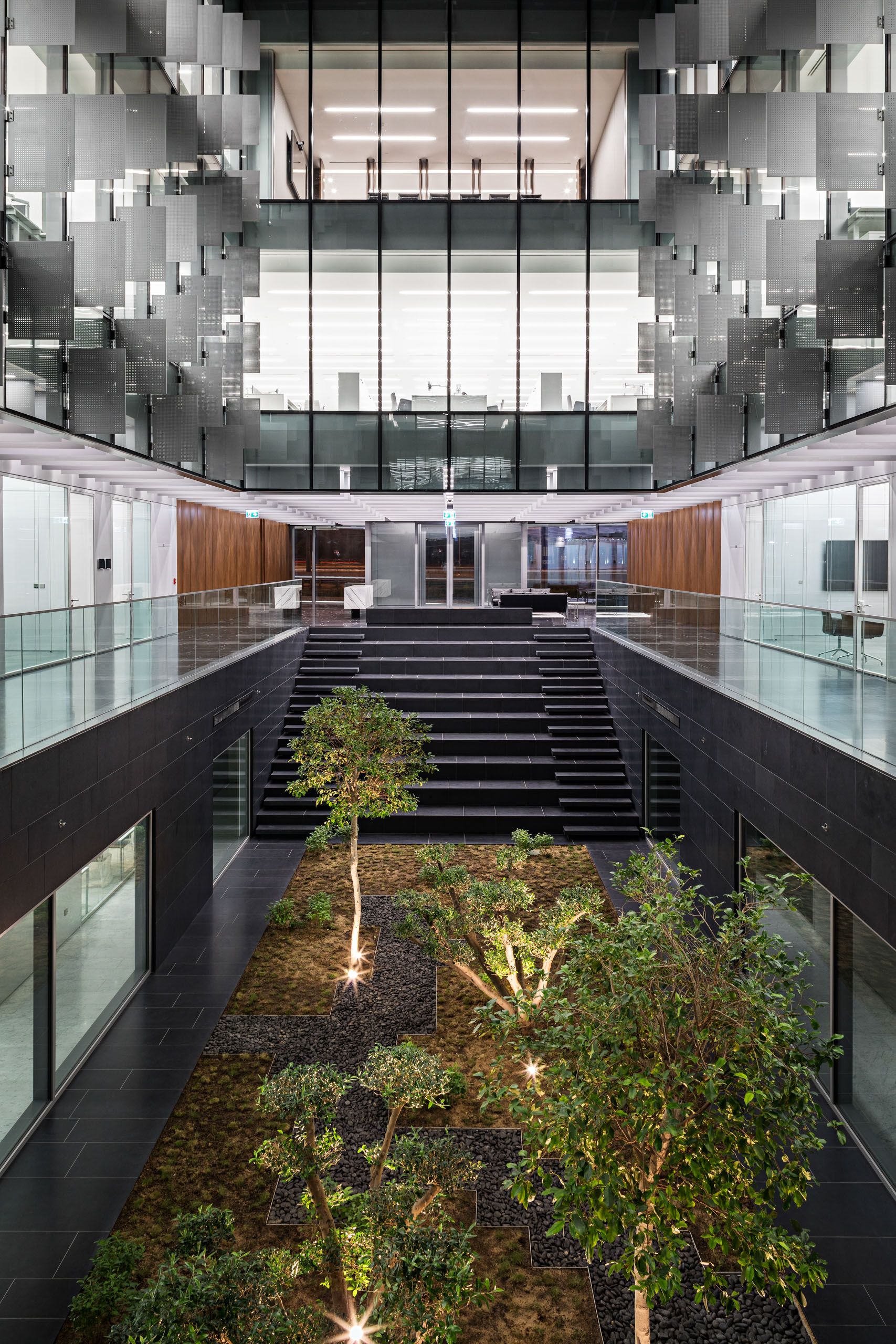 Le show-room a été pensé pour présenter les collections à la manière d’une galerie d’art. Le premier étage est formé d’espaces de bureaux ouverts sur le vaste atrium central, cœur lumineux du projet. Le second niveau abrite les bureaux des départements de la finance et du marketing, des salles de réunion, ainsi que des salons VIP. Le troisième et dernier niveau est réservé aux luxueux bureaux et salles de réunion de la direction.