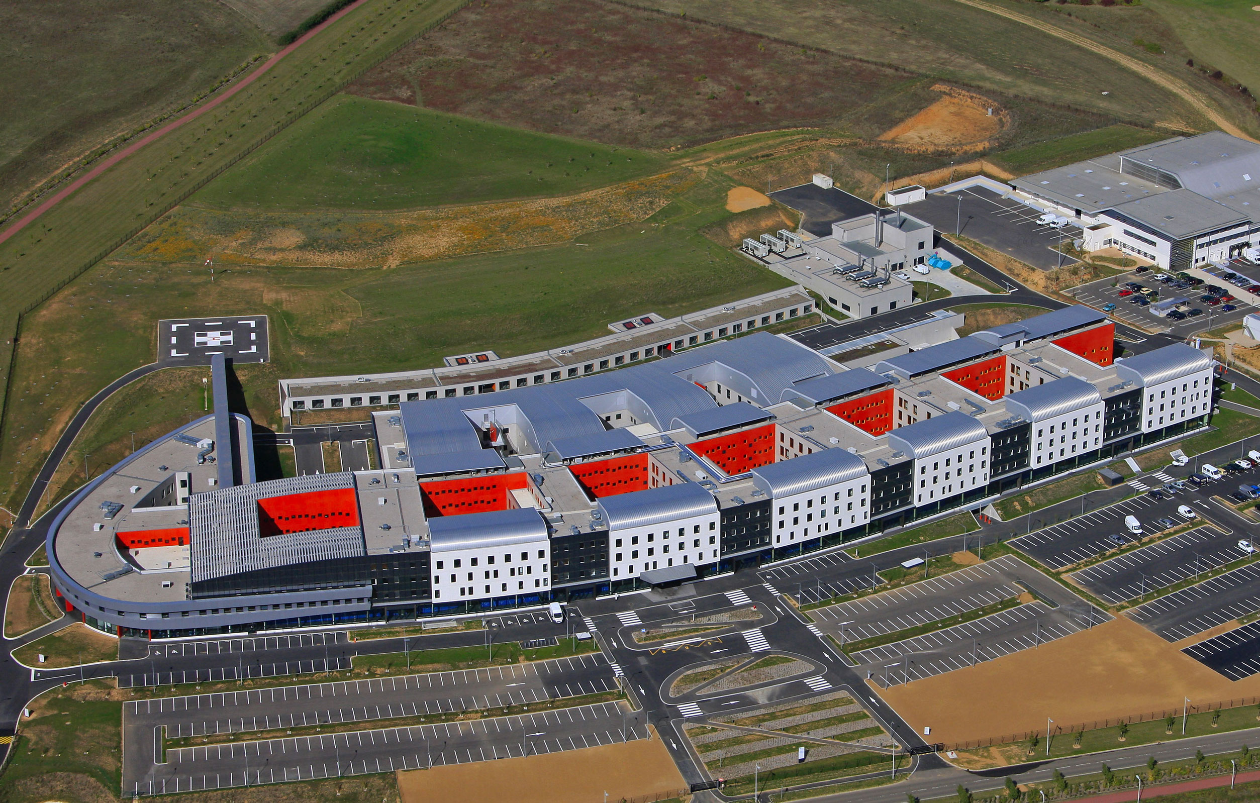 L’organisation de l’hôpital prévoit une flexibilité d’usage pour le futur : l’ensemble des secteurs bénéficient d’une grande souplesse d’utilisation et d’évolutivité. Deux typologies de bâtiments se superposent et dessinent une ligne bâtie dans le paysage. Les services d’hospitalisation sont tournés vers la ville et se prolongent à l’ouest par un bâtiment accueillant le pôle Mère-Enfant. Celui-ci s'ouvre sur une large parvis d'accès qui permet de drainer le public depuisle parking paysager.