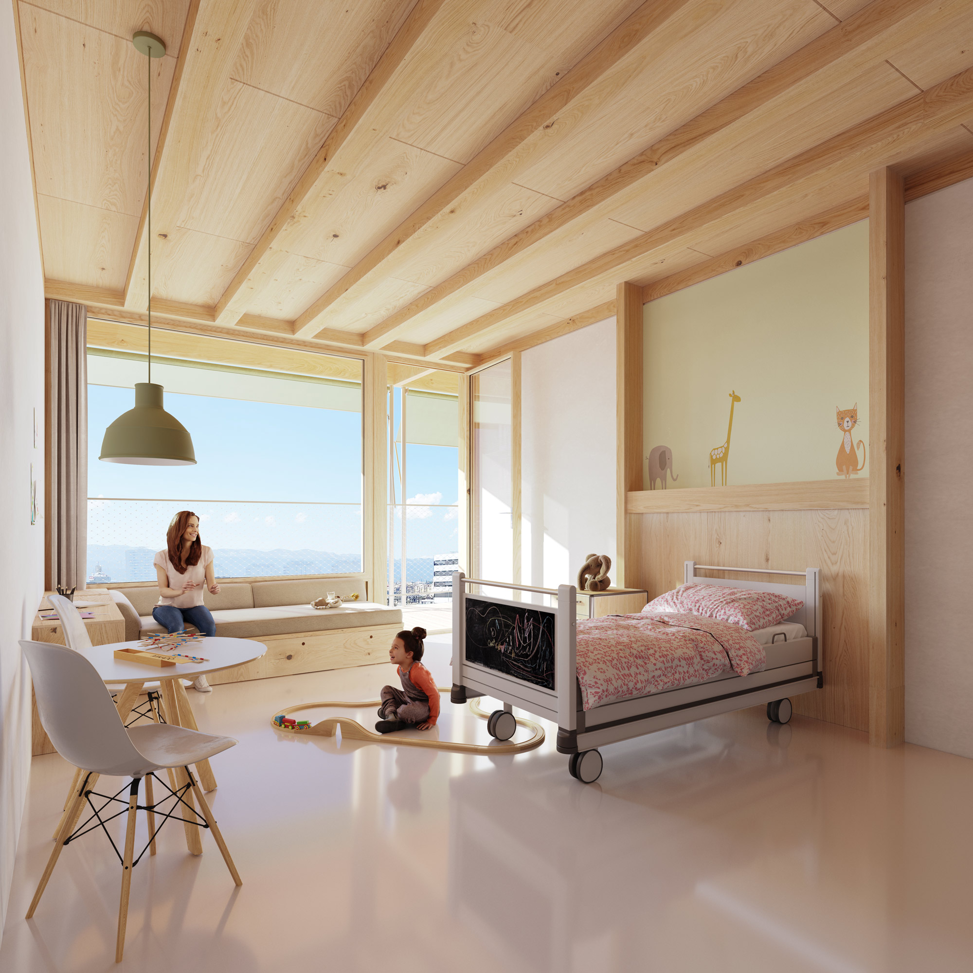 Pour un enfant, un séjour à l’hôpital peut s’avérer effrayant, provoquer un isolement synonyme de repli sur soi et entraîner des difficultés scolaires. La présence des parents aux côtés de l’enfant est essentielle et contribue à son rétablissement. Le futur hôpital prend en compte ces dimensions. Il fait une large place aux familles en respectant leur intimité et en reconstituant la cellule familiale.