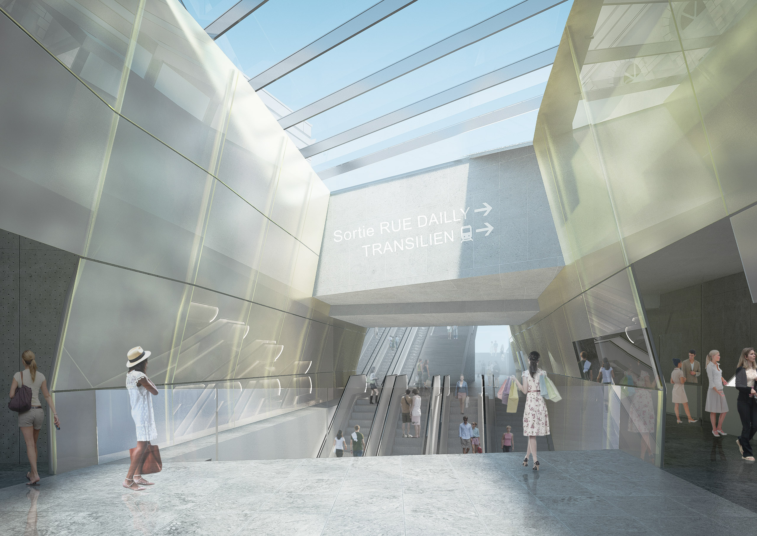 Ce projet impulse la construction d’un écoquartier, dont la gare en constitue la porte d’entrée, regroupant une offre commerciale renouvelée. La gare s’intègre finement dans la parcelle, en alignement sur la rue Gallieni et les futurs bâtiments de l’éco-quartier bordant le mail piéton. Le bâtiment, constitué d’un volume rectangulaire transparent, se décale vers le nord pour dégager un grand parvis urbain et poursuivre le mail piéton. Conçue pour accueillir 401 voyageurs par minute à l’heure de pointe du matin et 420 à celle du soir, la gare guide les usagers de manière intuitive et métaphorique du ciel jusqu’à la terre. Le trajet du parvis jusqu’aux espaces d’embarquement est direct et une verrière centrale fait office de puits de lumière éclairant l’ensemble des niveaux souterrains de la gare.