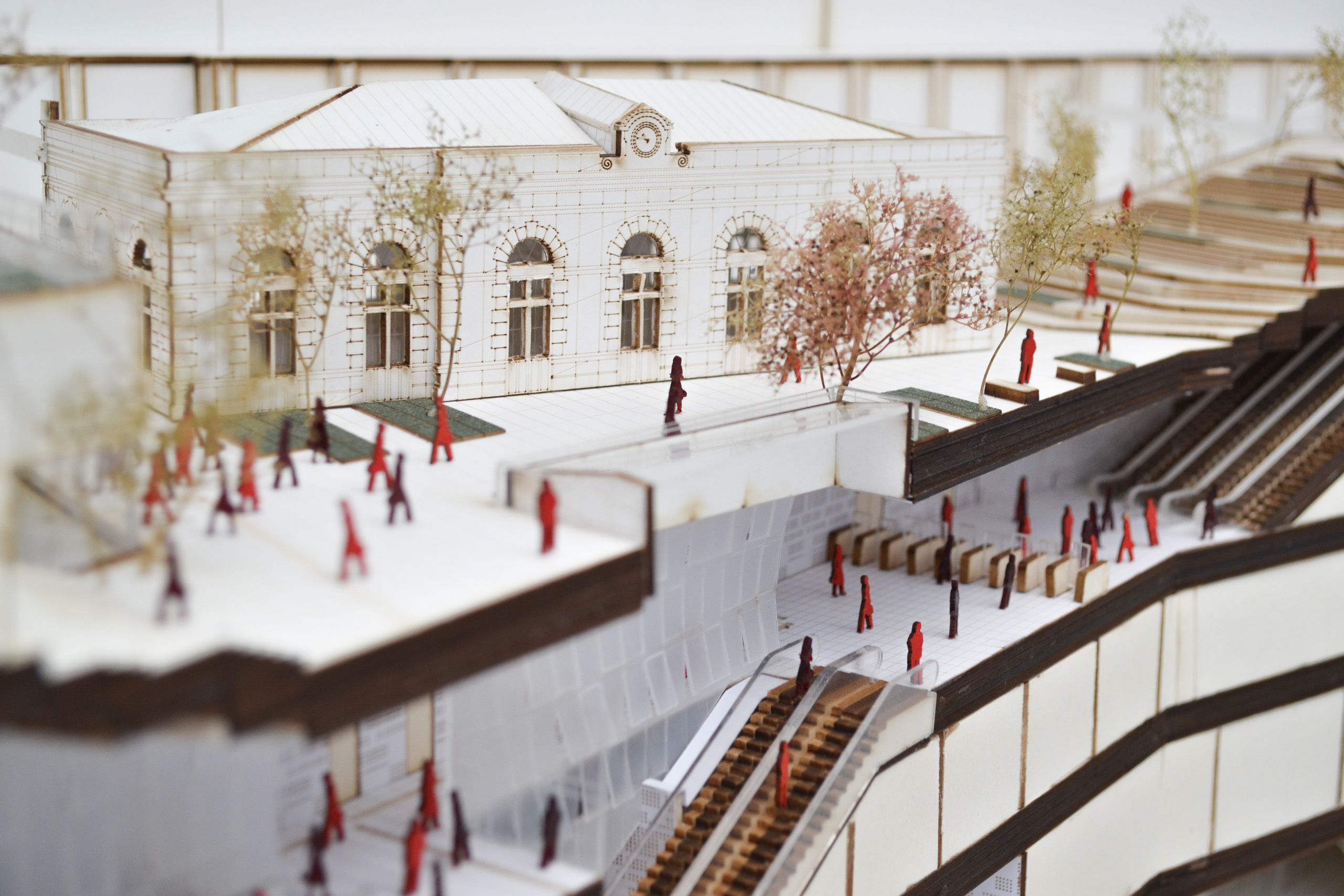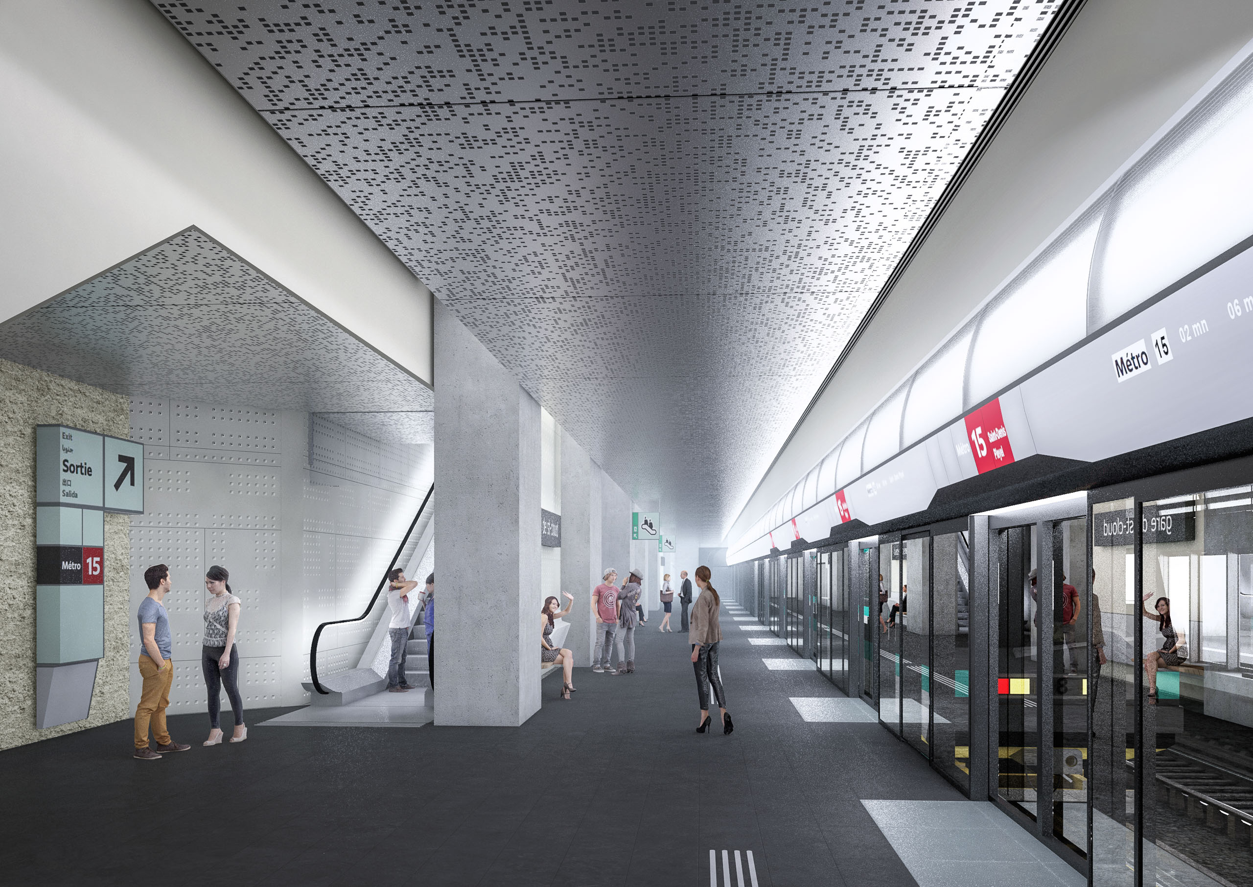 Le site où s’installe le dispositif a vocation d’absorber une double topographie en amorçant notamment la création de circulations piétonnes perpendiculaires à la colline. Le gabarit de la gare limite au maximum les émergences bâties afin de s’intégrer au relief de la colline et de créer une respiration dans la topographie accidentée du territoire. Conçue pour accueillir le transit de 401 voyageurs par minute à l’heure de pointe du matin et 420 à celle du soir, l’organisation de la gare regroupe un espace voyageur central, deux polarités commerciales entre le parvis et la salle d’échange, et un ensemble de locaux techniques nécessaires au fonctionnement général. Une grande verrière fait glisser la lumière naturelle jusqu’au quatrième sous-sol et sert de guide pour les usagers jusqu’à la sortie.