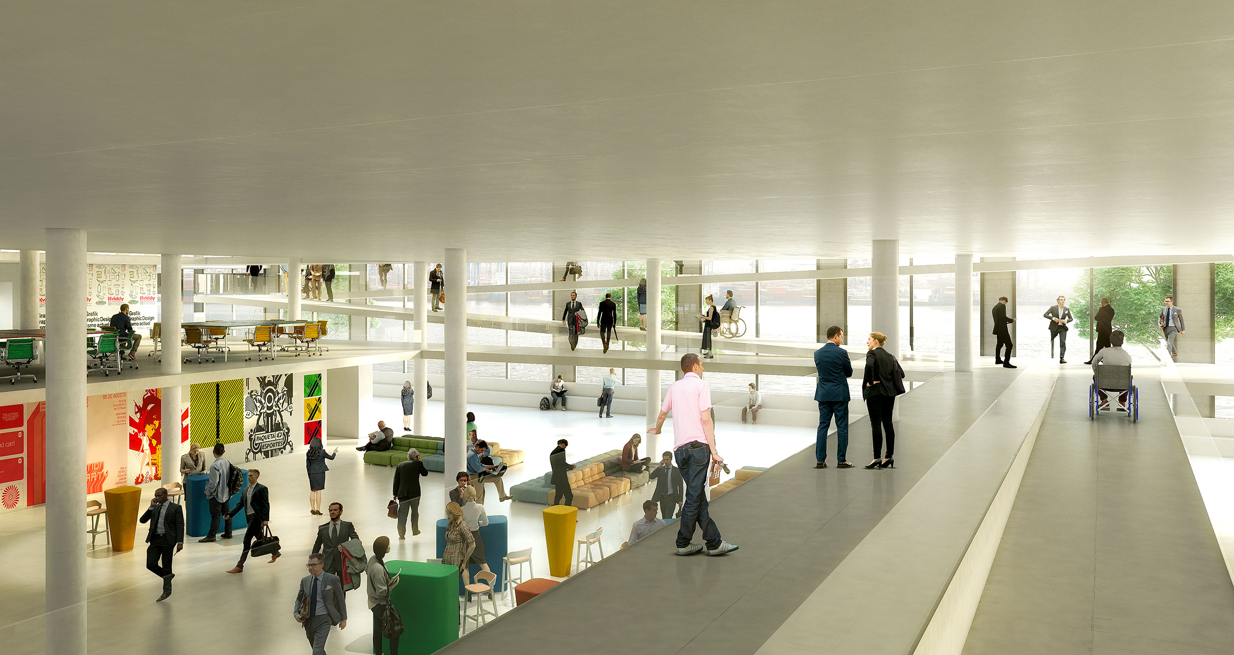 Le projet libère un passage semi-public au niveau du parvis de la gare. Une verrière enroulée sur l’ensemble des deux premiers niveaux du bâtiment offre une vitrine sur le fleuve et prolonge le quartier ouest de la ville jusqu’aux eaux de l’Elbe. Du côté de la gare se trouve l'entrée Est reliée à l'entrée principale par un large couloir intérieur longeant le fleuve. Ce « passage de l’Elbe » connecte tous les usages publics et semi-publics entre eux. L'accès est assuré par des rampes qui invitent le visiteur à se promener et constituent un promontoire fabuleux sur l'Elbe. Les rampes dominent également les espaces d'exposition depuis lesquels les circulations se retrouvent mises en scène.