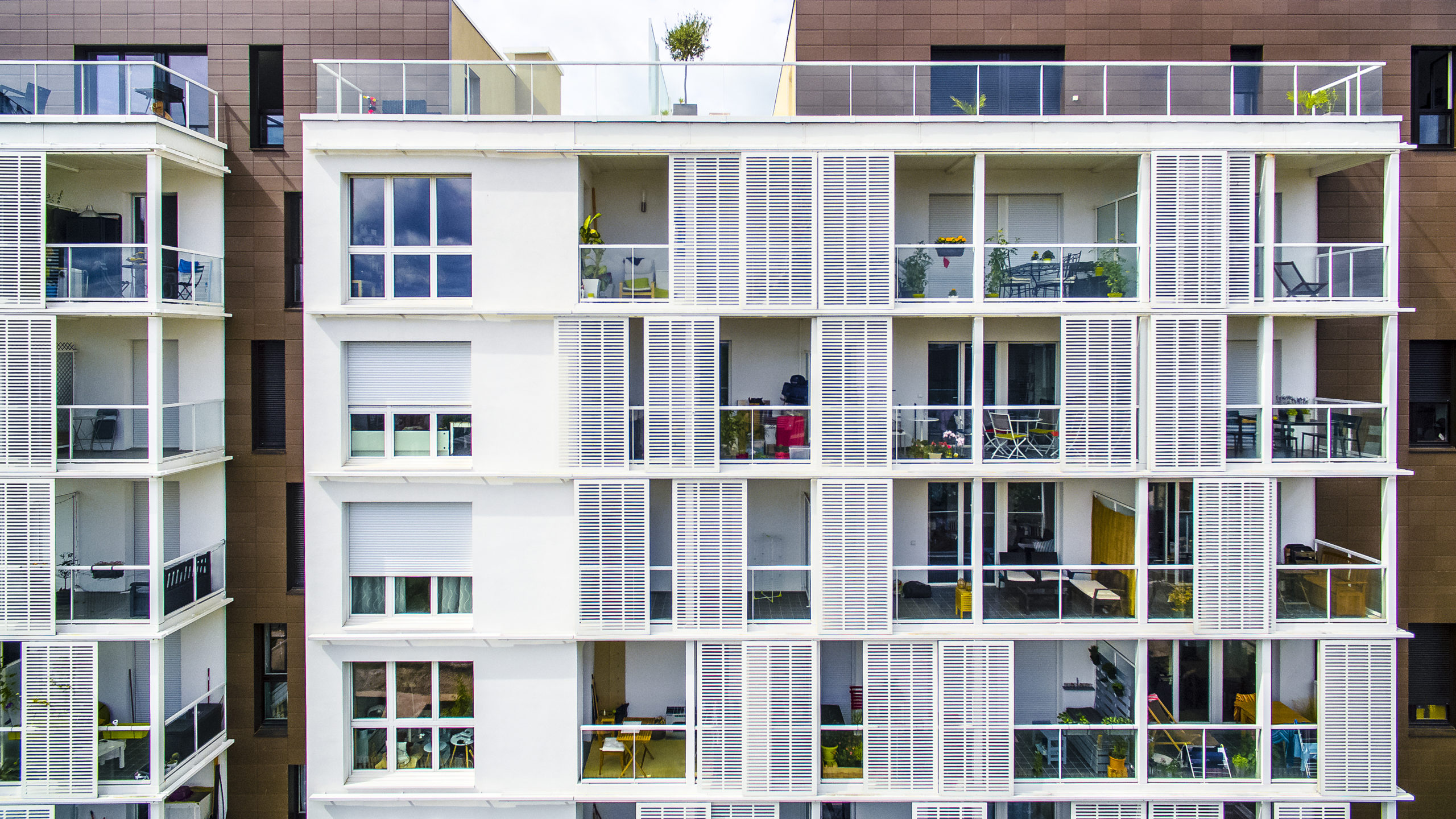 Les appartements aux étages bénéficient de surfaces annexes sous la forme de balcons ponctuels. Les appartements en rez-de-chaussée sont prolongés par des jardins individuels, et la cour centrale, ouverte au public, est traitée comme un espace de circulation majeur. Une enveloppe porteuse extérieure en acier soutient les panneaux de protection solaires dont le calepinage dessine une mosaïque caractéristique du projet.