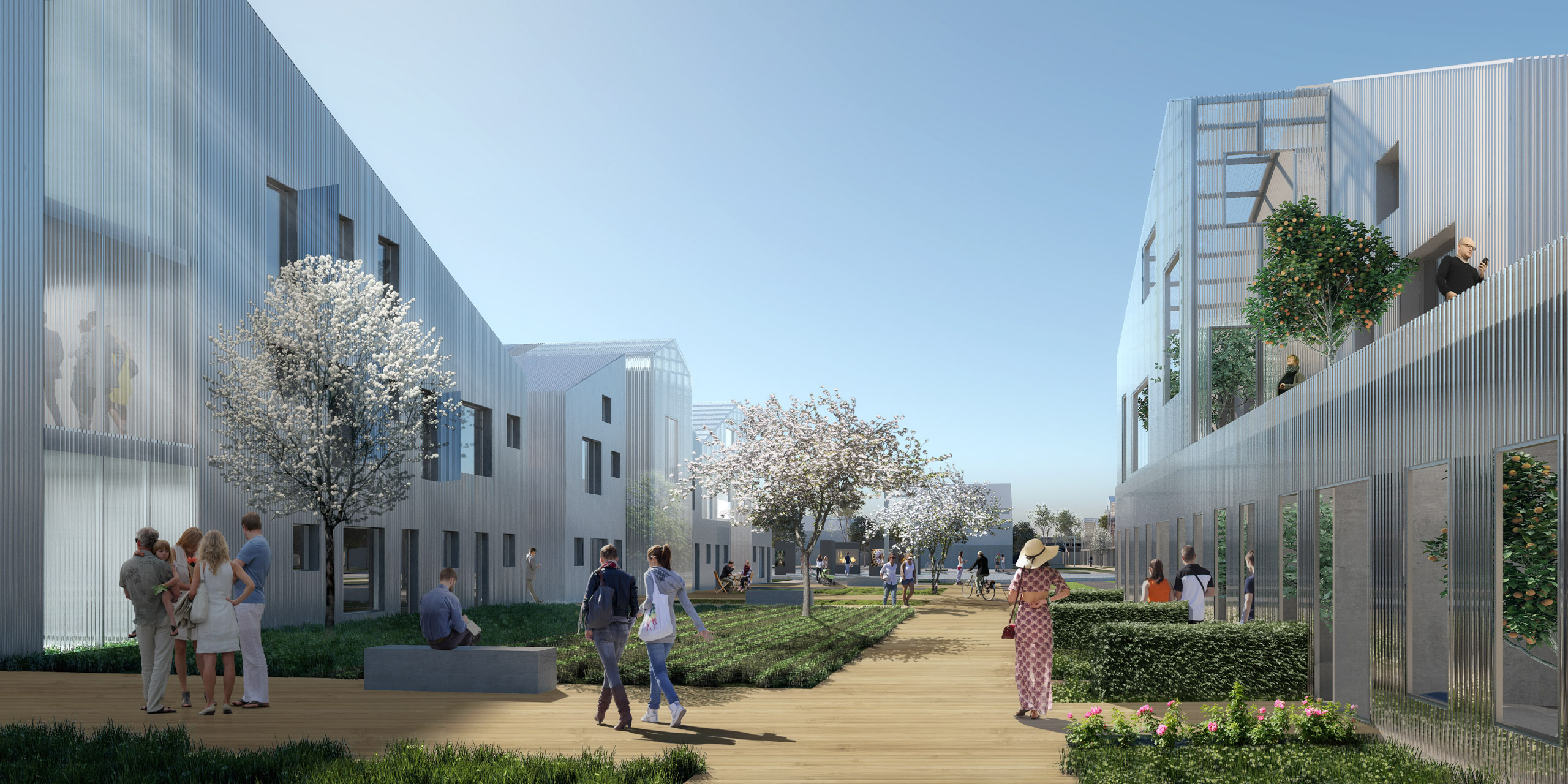 Le nouveau quartier « productif » intègre une production agricole dans deux silos horizontaux réhabilités, et vise une autonomie énergétique grâce à l’installation de panneaux photovoltaïques et la récupération de l’énergie fatale d’un site industriel voisin. Prônant l’économie circulaire, il invite à une consommation directe in situ des produits récoltés aux moyens d’une logique directe producteur/consommateur, l’implantation d’un restaurant panoramique dans le silo vertical réhabilité et de services mutualisés. Le projet souhaite développer un espace public fédérateur et vecteur d’urbanité à l’échelle du quartier par l’aménagement d’un grand parvis scénique ouvert sur la ville. Dans un contexte majoritairement pavillonnaire et parsemé de bâtiments d’activités, l’agri-quartier multiplie les pistes de synergies entre les différents fragments urbains et propose une nouvelle centralité à l’échelle de la ville. Les espaces extérieurs sont pensés comme des lieux de rencontres, entre jardins agricoles, jardins récréatifs et jardins paysagers.