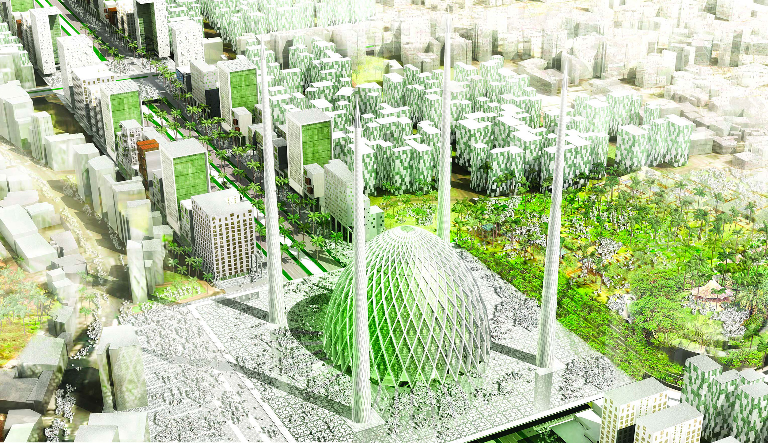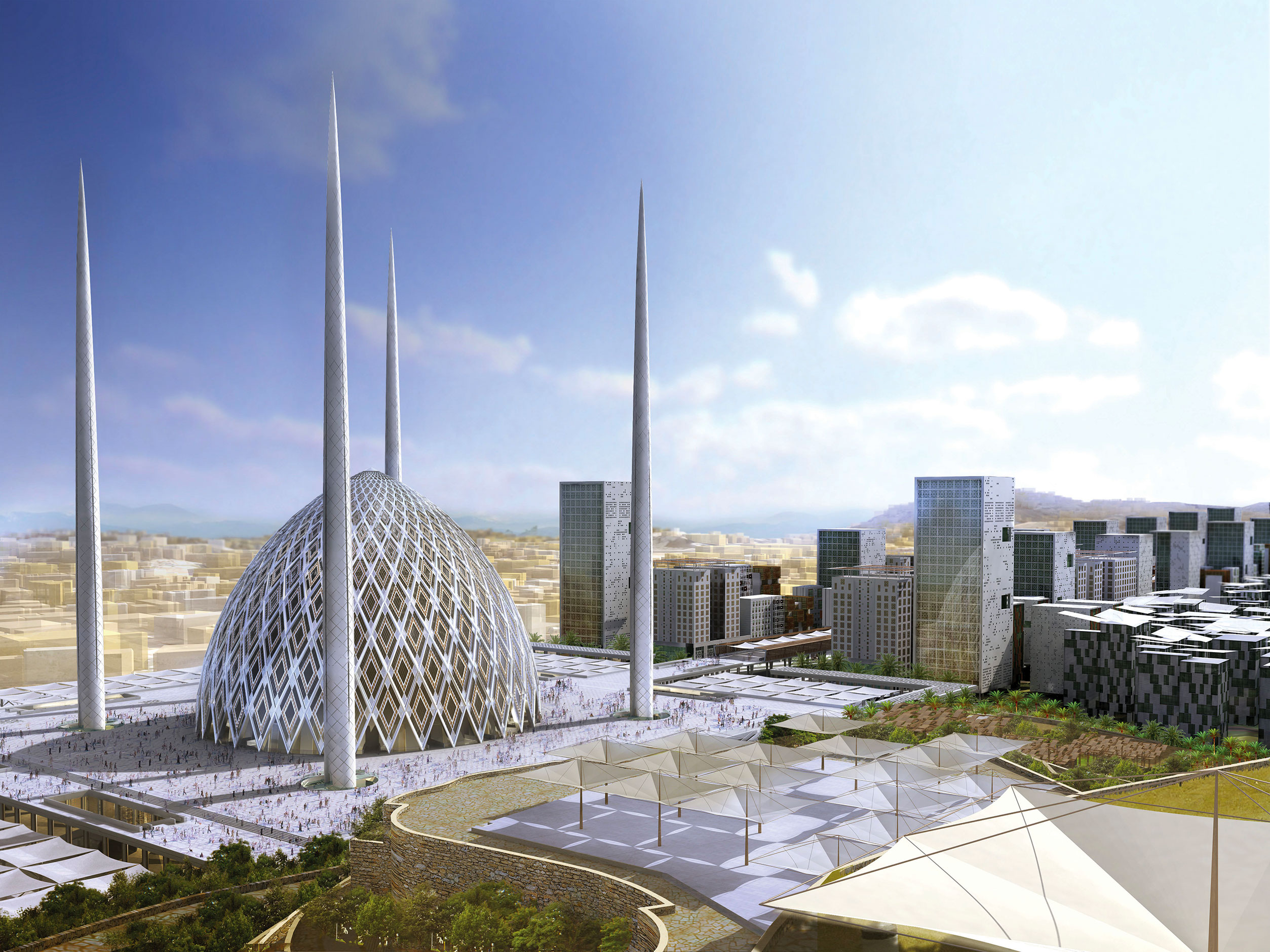 L’architecture de la Mosquée est conçue pour structurer son environnement urbain. Ainsi, l’esplanade de 156 x 156 m sous laquelle prend place un centre de congrès dédié à la théologie, assure une articulation architecturale et urbaine forte au niveau de la ville. Elle permet de relier entre eux la Mosquée, l’avenue du Roi Abdul Aziz, l’avenue Umm Al Qura, et le nouveau Makkah Central Park. Au centre de cette esplanade, la coupole à double coques haute de 65 m et les quatre minarets hauts de 120 m qui l’encadrent, forment un signal fort qui marque la direction et le chemin vers la Mosquée du Haram.