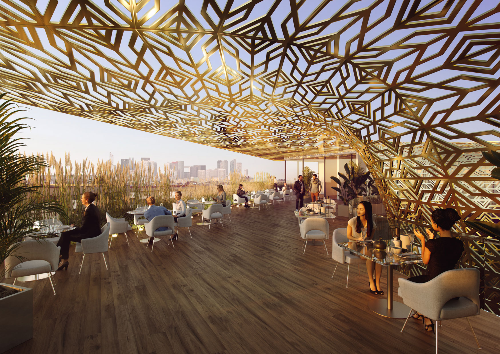 Le socle, transparent et animé, crée un dialogue avec les rues et anime le quartier. Le corps du projet regroupe les espaces de travail, adaptés aux nouveaux usages, ainsi que des jardins d’hiver et des lieux de convivialité. Le bâtiment se construit autour d’un patio, véritable cœur de vie ouvert sur tous les niveaux, qui constitue un puits de lumière pour les bureaux. De grands espaces d’échanges sont répartis dans les étages, ils favorisent la rencontre et impulsent un nouveau dynamisme à l’édifice. L’attique constitue le signal urbain à l’échelle du quartier. Implanté sur un jardin, il émerge des toitures environnantes. Enfin, un large claustra vient envelopper les étages exposés au soleil pour les protéger et marquer une interface avec le ciel.