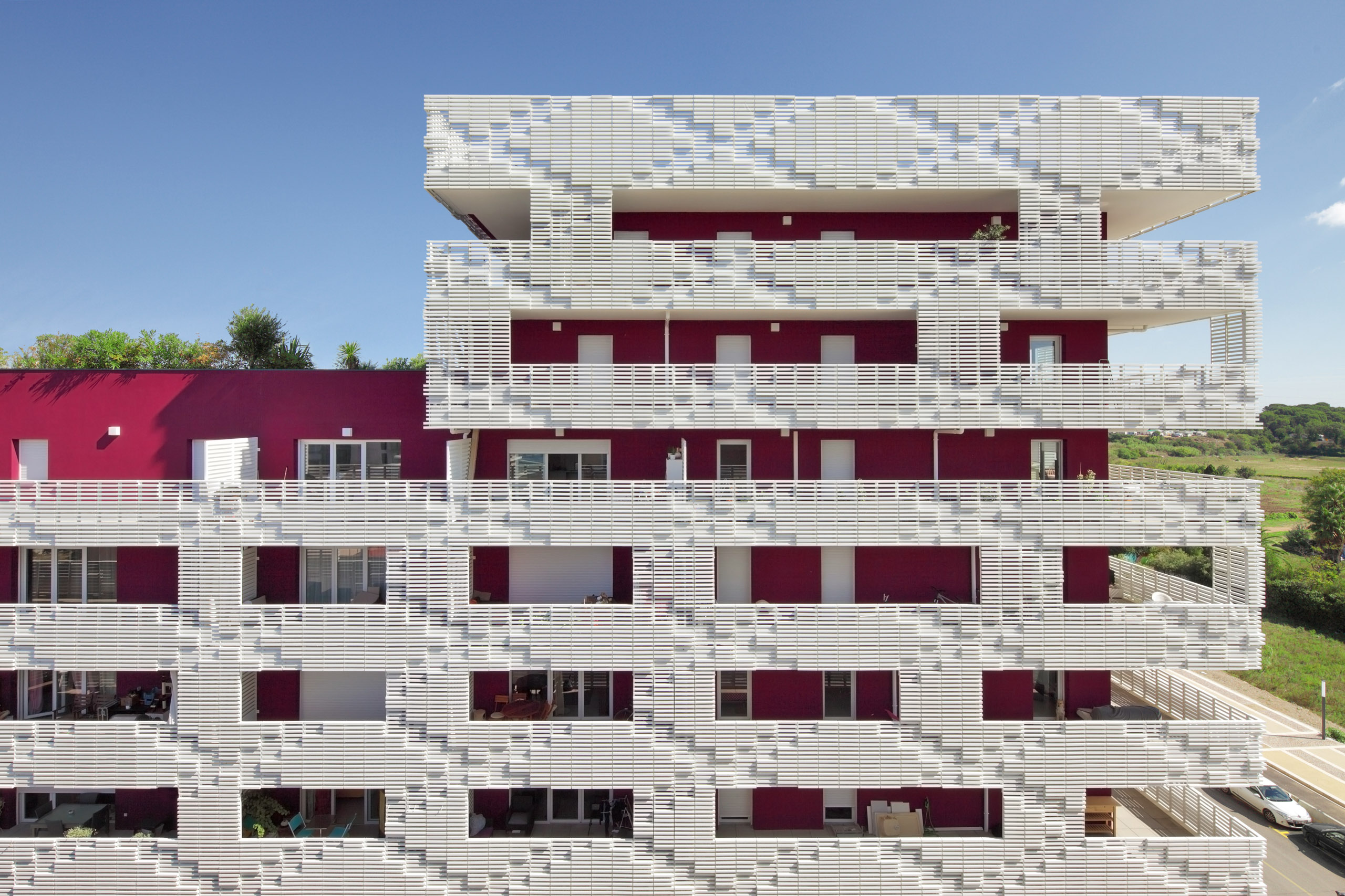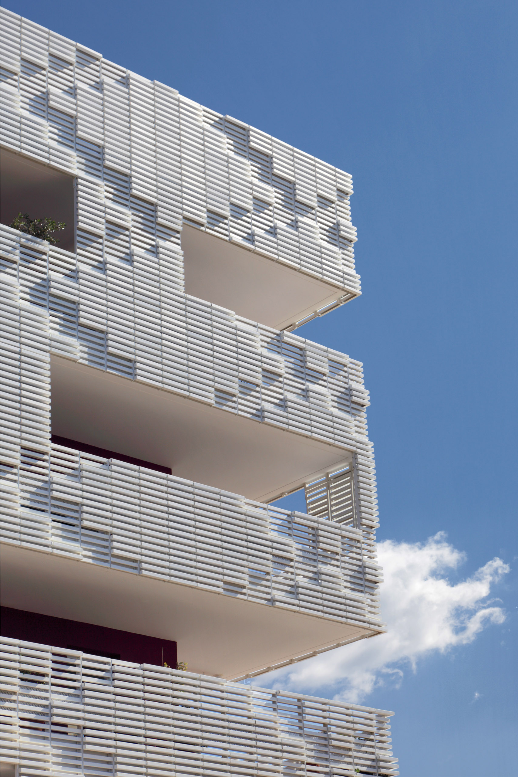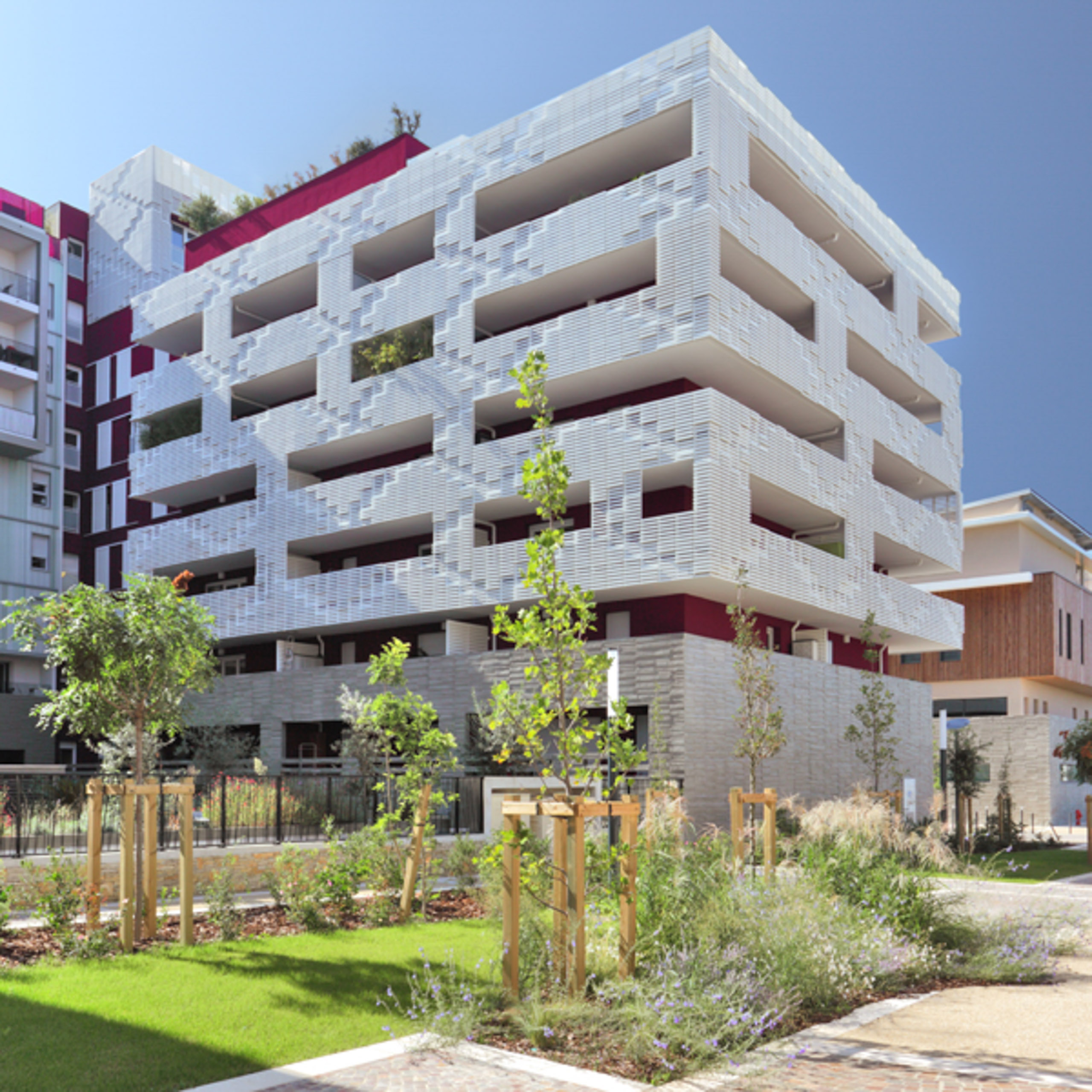 La volumétrie du bâtiment se découpe en trois éléments verticaux, communs à toutes les opérations du quartier : le socle, le corps principal et l’attique. L’édifice présente la particularité d’être entouré de terrasses actives sur toute sa périphérie. Il est caractérisé par deux traitements architecturaux majeurs. Un premier traitement en béton architectonique continu percé pour le socle, est en liaison directe avec l’espace public. Un second habillage en claustra constitué de lignes ajourées pour le corps et l’attique, offre un jeu subtil et permet d’appréhender le bâtiment différemment en fonction de l’angle de vision. Cet élément recouvre l’ensemble des garde-corps et se poursuit sur les brise-soleils, marquant ainsi une continuité verticale du bâtiment sur toute sa hauteur. Les rayons du soleil s’impriment dans la masse de la façade et créent un graphisme abstrait qui joue entre ombre et lumière. L’épaisseur et la conception de cette façade permet un système de régulation environnemental et thermique en adéquation avec les objectifs du label BBC. La notion de bien-être est l’une des lignes directrices du projet, principalement orchestré par le traitement de la façade, améliorant les lieux de vie grâce à ses qualités d’ombrière.