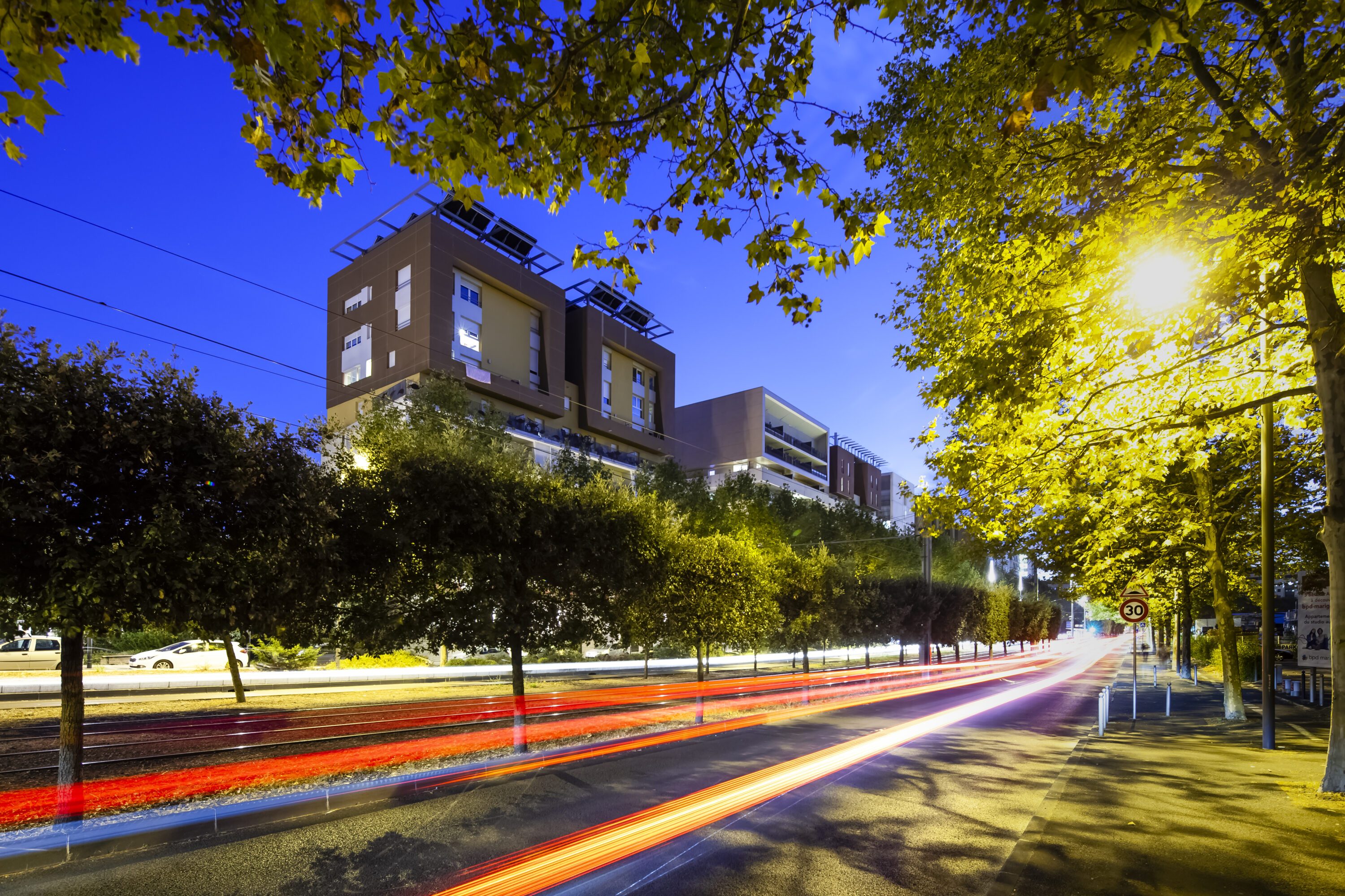 Le long des avenues, les immeubles forment un front bâti dense, rythmé de commerces, et côté parc, ils sont en gradins et offrent aux habitations le plus de vues possibles sur le vaste espace vert.
