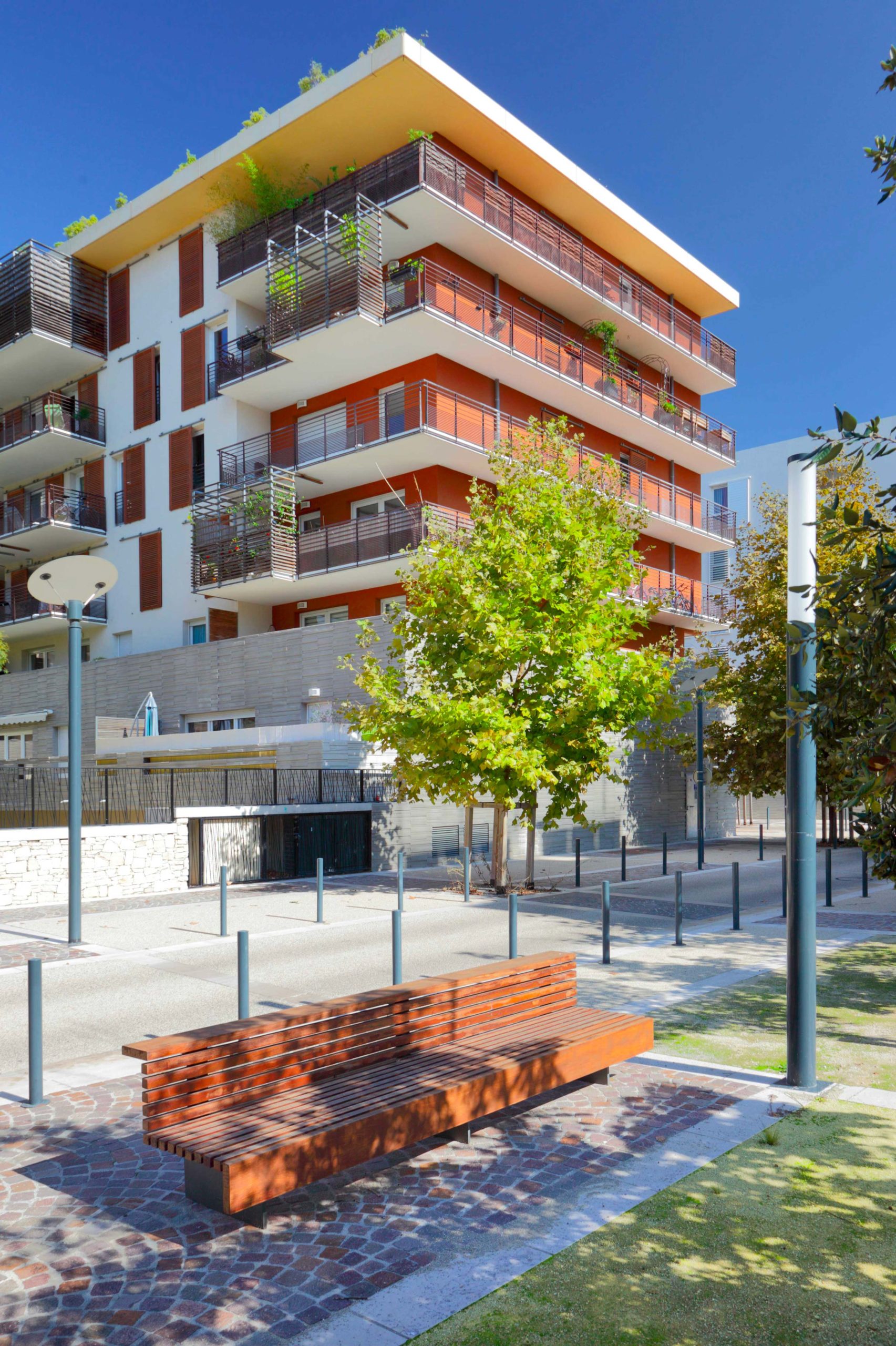 La volumétrie en gradins du bâtiment assure la transition entre le Parc Charpak et les masses bâties du quartier. Ce système d’épannelage libère de grandes surfaces de terrasses et fait glisser la lumière naturelle jusqu’aux étages bas, assurant ainsi un cadre de vie privilégié aux habitants. Poursuivant un objectif de cohérence architecturale et d’unité au sein de la ZAC, le matériau choisi pour le socle, le béton brut matricé gris anthracite, est le même pour toute la ZAC. Face à l’avenue du Mondial 98, la façade Nord est traitée de façon continue pour répondre à la linéarité avec un jeu de relief et de matières. Sa pré-façade, en béton architectonique ocre clair, est percée d’ouvertures verticales, laissant apparaître la façade en enduit RPE blanc cassé. Elle constitue une barrière acoustique en filtrant le bruit de la circulation de l’avenue du Mondial 98. Les boîtes au R+8 et R+9 sont habillées de bois. Longeant la voie de desserte, la façade Est donne lieu à des décalages d’ouvertures et d’alternances harmonieuses de vides et de pleins constitués par les garde-corps en bois et des boîtes en béton architectonique. Elle est couverte d’un enduit minéral dans les parties en retrait, et de couleur marron sur les autres parties. La façade Ouest en intérieur d’îlot, donnant sur le jardin, fait l’objet d’un traitement plus libre. Ouverte sur le jardin, elle est constituée de balcons et de loggias permettant de profiter de la lumière du sud et de la ventilation naturelle. Cette stratification, couplée à la séquence en gradin générale, transpose le bâtiment comme un élément fort du paysage du parc et propose un confort idéal aux habitants et aux passants.