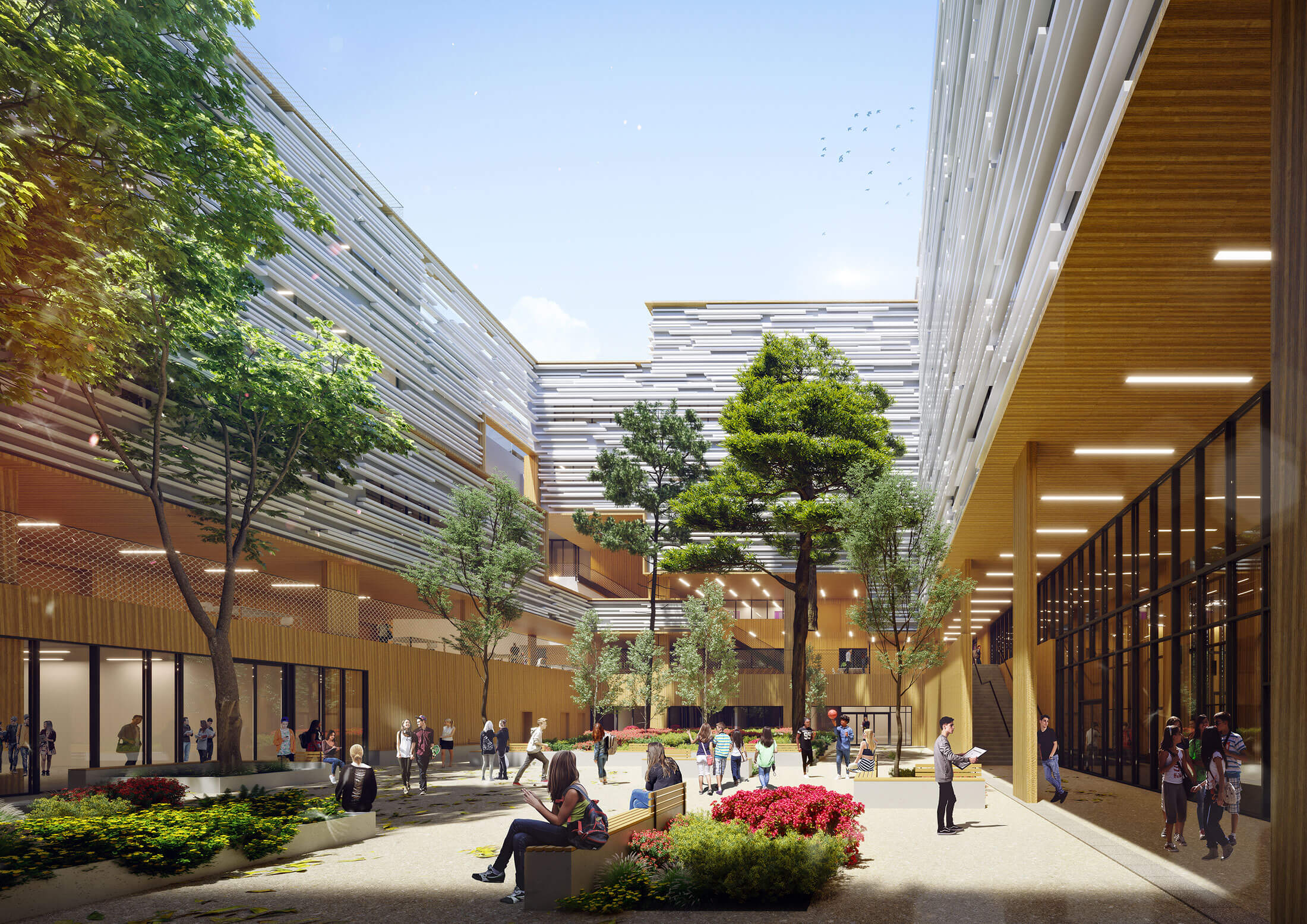 S'inscrivant au coeur du projet urbain du Parc Habité, la Cité Internationale cultive le dialogue à la ville et au quartier par le rapport à la rue, les gabarits, les retraits et les rythmes qui permettent l'ensoleillement et la multiplication des vues. Les volumes bâtis sont conçus et composés afin d'apporter un ensoleillement optimal même en coeur d'îlot, au travers d'un travail sur le rythme entre espaces vides et espaces pleins, ouverts et fermés. Véritable parc, le projet présente une surface importante en matière d'espaces extérieurs : cours, parvis, terrasses des galeries verticales, toiture accessible. Le fractionnement des volumes les uns sur les autres libèrent un maximum d'emprise et crée des interfaces privilégiées entre les différentes entités (école élémentaire, collège, lycée, pôles culturel et sportif) complètement autonomes. Véritable signal urbain, la peau des façades constituées de lames horizontales, s'entre-ouvre pour révéler les intérieurs aux passants et offrir de nouveaux horizons aux usagers. Les espaces intérieurs sont confortables, modulables et disposent d'un éclairage adapté, respectueux des cycles circadiens.