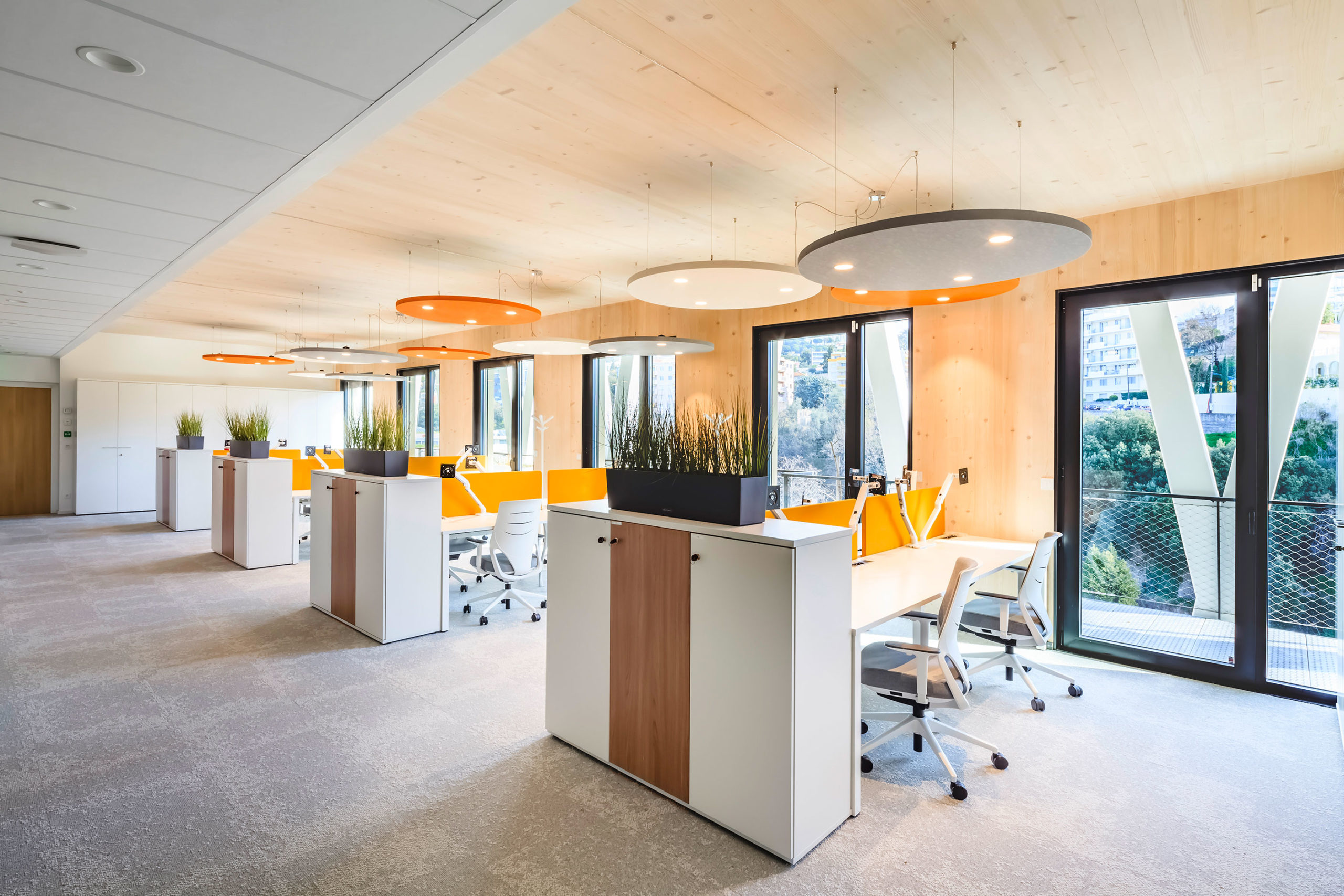 Le bois est prédominant dans l’aménagement intérieur, qui est ouvert et réversible grâce à de grands plateaux offrant des circulations et des agencements multiples. L’exosquelette métallique du bâtiment, comme un paravent, supporte les circulations verticales situées en périphérie, sa peau extérieure est une structure arborescente qui s’élève vers le ciel. La structure bois permet de réaliser un immeuble de 9 niveaux, simplement contreventé par deux cages d’ascenseurs judicieusement positionnées. Il n’y a pas de façades, à proprement parler, mais une succession de plans qui offrent une qualité d’usages complémentaires aux lieux de travail.