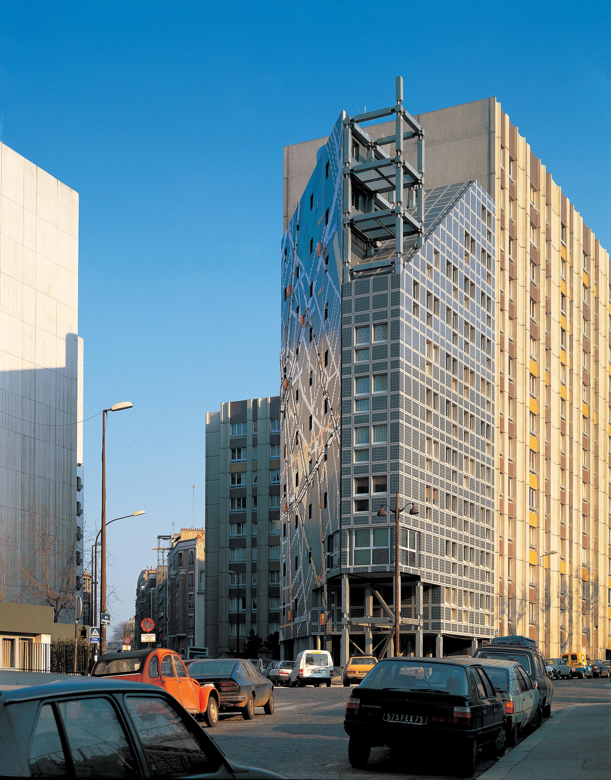 Le projet Stimuli s’est attaché à recenser les parcelles résiduelles encore constructibles à Paris et dans sa proche périphérie. Le bâtiment construit dans le XIIIème arrondissement de Paris fut la première application de cette démarche de mise en réseau. L’immeuble pointu de la rue du Château-des-Renies agit sur son environnement à la façon d’une aiguille d’acupuncture implantée dans un tissu vivant afin de revitaliser l’organisme. La petite parcelle de 150 m² est dominée par un mur aveugle de plus de 30 mètres de hauteur sur lequel s’appuie la base du plan triangulaire.