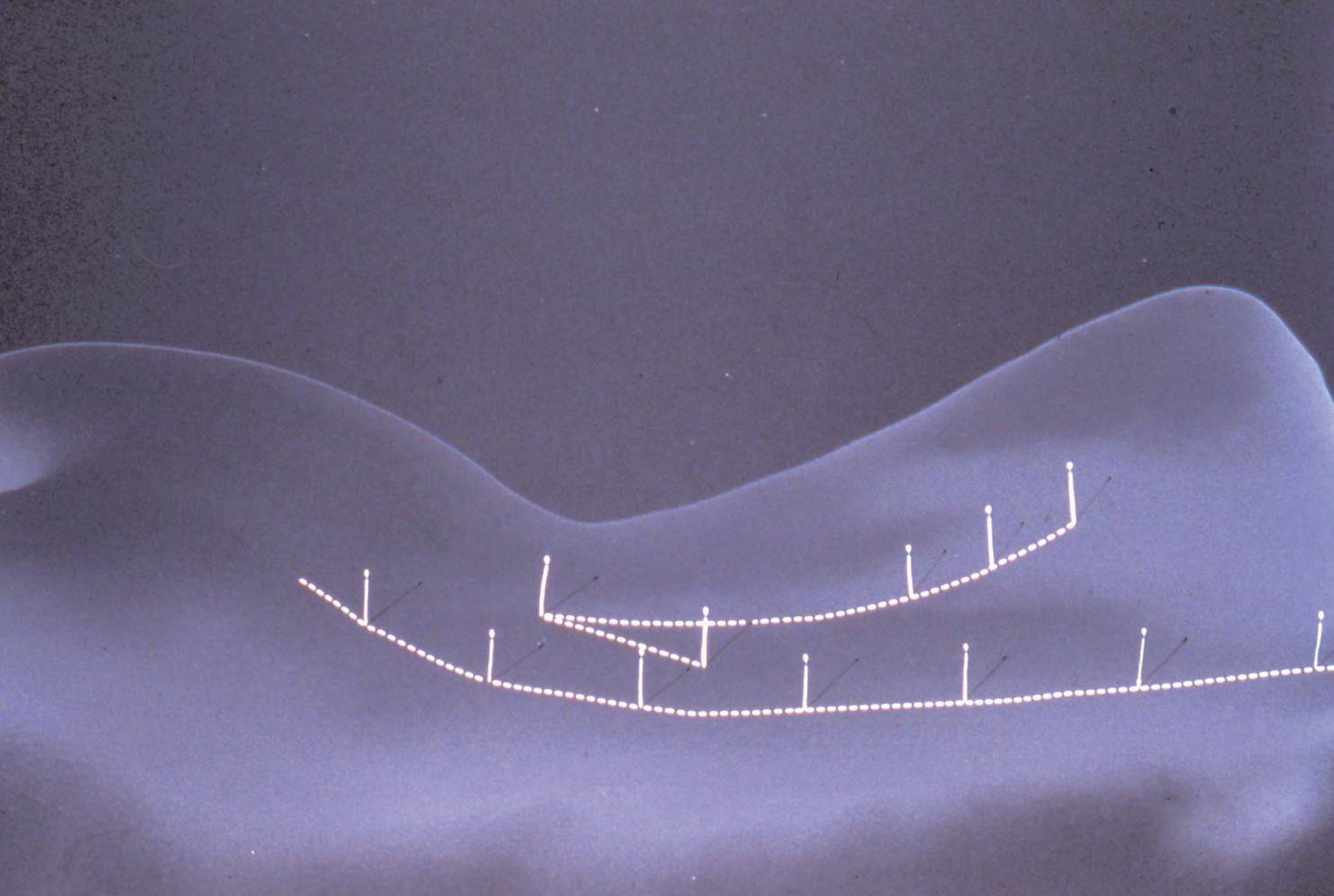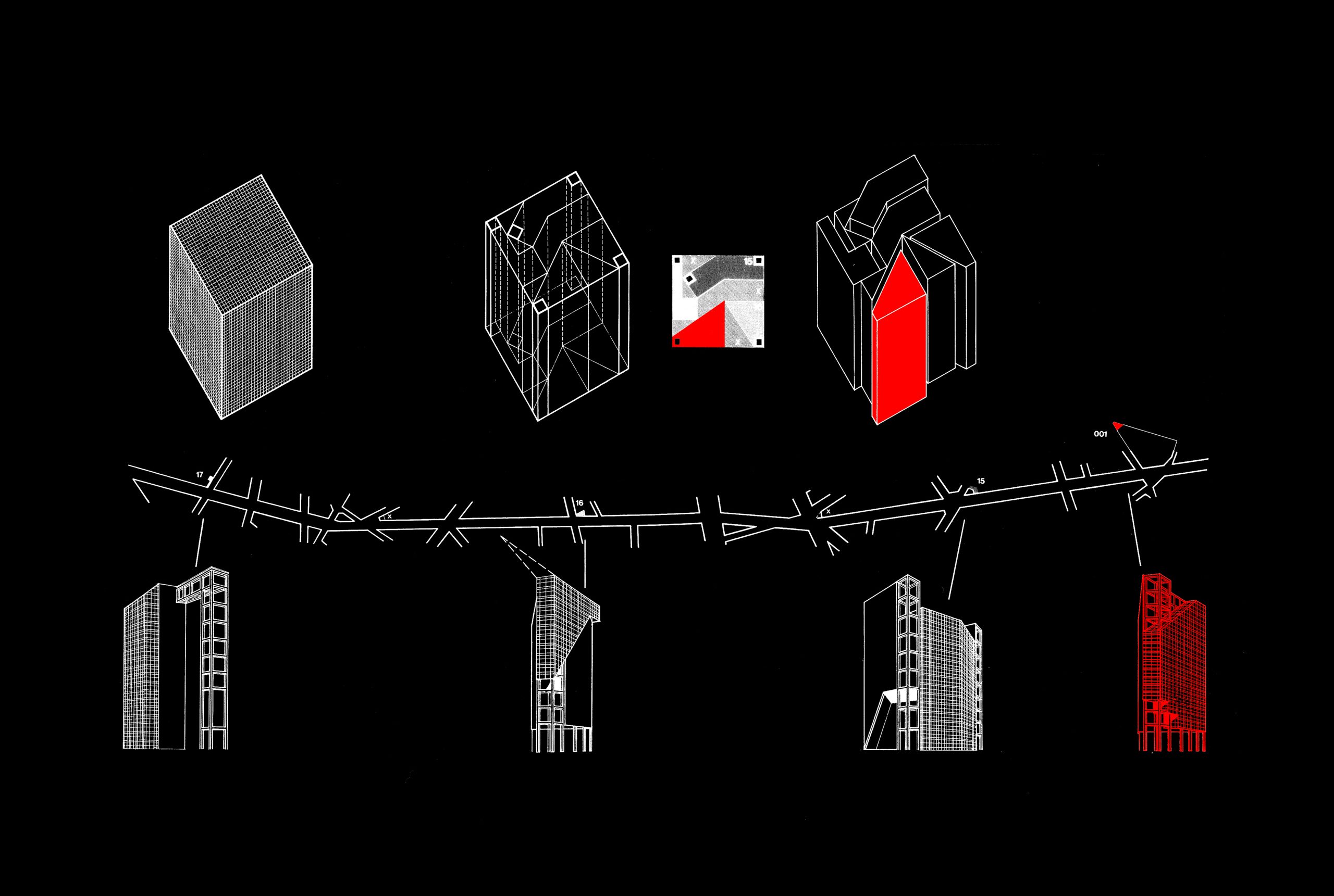 Le projet a pour vocation de relancer le développement urbain en partant de territoires exclus qui, une fois reconquis, étendent la dynamique de densification et se matérialisent par un bâti envisagé comme la nouvelle borne de l’évolution frontalière. L’immeuble-borne de onze niveaux abrite vingt-cinq logements. L’ensemble est surélevé par une structure sur pilotis métallique qui dégage une large partie au sol rendue à l’espace public. Conçu comme un élément de mobilier urbain habitable, cet édifice renvoie à une lecture plus globale de la ville dont il prétend n’être qu’un fragment. Le grand mur nord assume l’échelle hors-norme en intégrant une gigantesque carte du quartier qui illumine la nuit des stations de bus ou métro repérées en sur le plan. Le résultat proposé est une transposition physique de la triangulation qu’imposant la forme géométrique de la parcelle. Les façades hors d’échelles par rapport aux mesures du sol incarnent la démesure dont l’architecture fait sa matière et l’excès dont elle tire toute la logique. Le nez fin de la façade d’angle et la structure aérienne apparente confère élégance et légèreté à l’édifice. Ce premier essai s’inscrit dans la volonté d’établir un réseau de parcelles résiduelles à reconquérir dont est émaillée la ville de Paris.