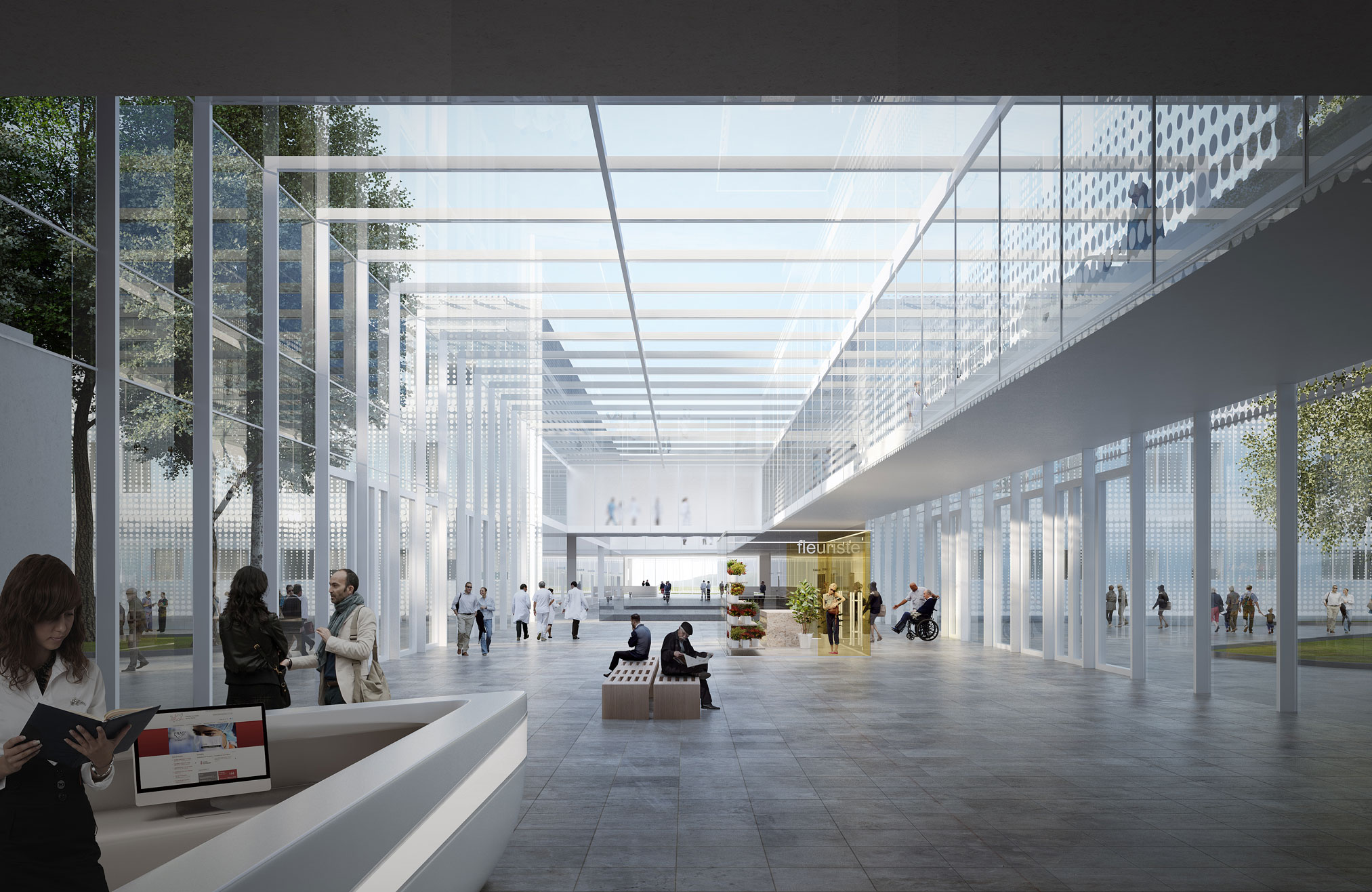L’implantation du projet tire avantage du terrain en pente et permet un accès direct au service des urgences. Depuis le parking, les visiteurs sont guidés à travers une séquence paysagère vers la nouvelle entrée de l’hôpital, au cœur de la rue intérieure. Cette large galerie vitrée en double hauteur permet aux piétons d’accéder à l’ensemble des bâtiments du site, jusqu’à la crèche située au sud du bâtiment.