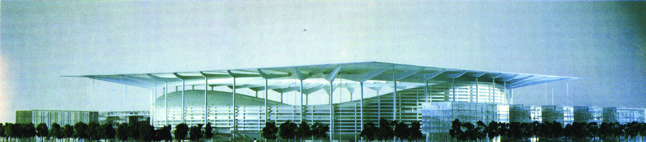 À l’image des plazas de toros des villes espagnoles ou du terrain de cricket des villes coloniales anglaises, l’arène qui entoure l’aire de jeu initie le tracé urbain. Le rectangle de la pelouse, l’ovale des tribunes, puis à l’extérieur, deux figures simples, le cercle de l’arène et le carré de la toiture structurent la géométrie de la ville. L’anamorphose des volumes définit des espaces complexes, des épures rigoureuses de structure.