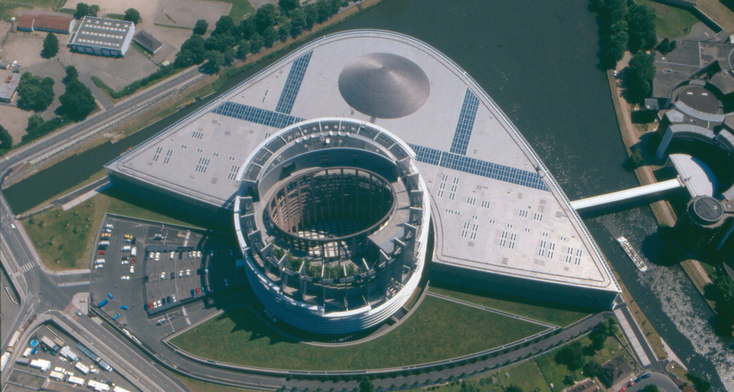 Le Parlement Européen est un repère, identifiable, directement ou par la transmission de l’image, à l’échelle de la ville, de l’Europe et du monde. La forme circulaire classique de la tour centrale intègre une cour en forme d’ellipse baroque : du cercle de Galilée à l’ellipse de Képler, le passage du symbole de la centralisation à celui de la pluralité des centres, du pouvoir centralisé à la multipolarité de la démocratie européenne est ainsi largement assumé. Suivant la courbe de l’Ill, la façade vitrée révèle le volume de l’hémicycle à travers la forme du dôme, faisant de la transparence une expression à la fois architecturale et politique. Au-delà de ses fonctions premières, le parlement incarne une symbolique forte, attirant un grand nombre d’européens venus admirer la mise en scène d’une architecture totale au service de la ville, de la politique et de l’Europe toute entière.