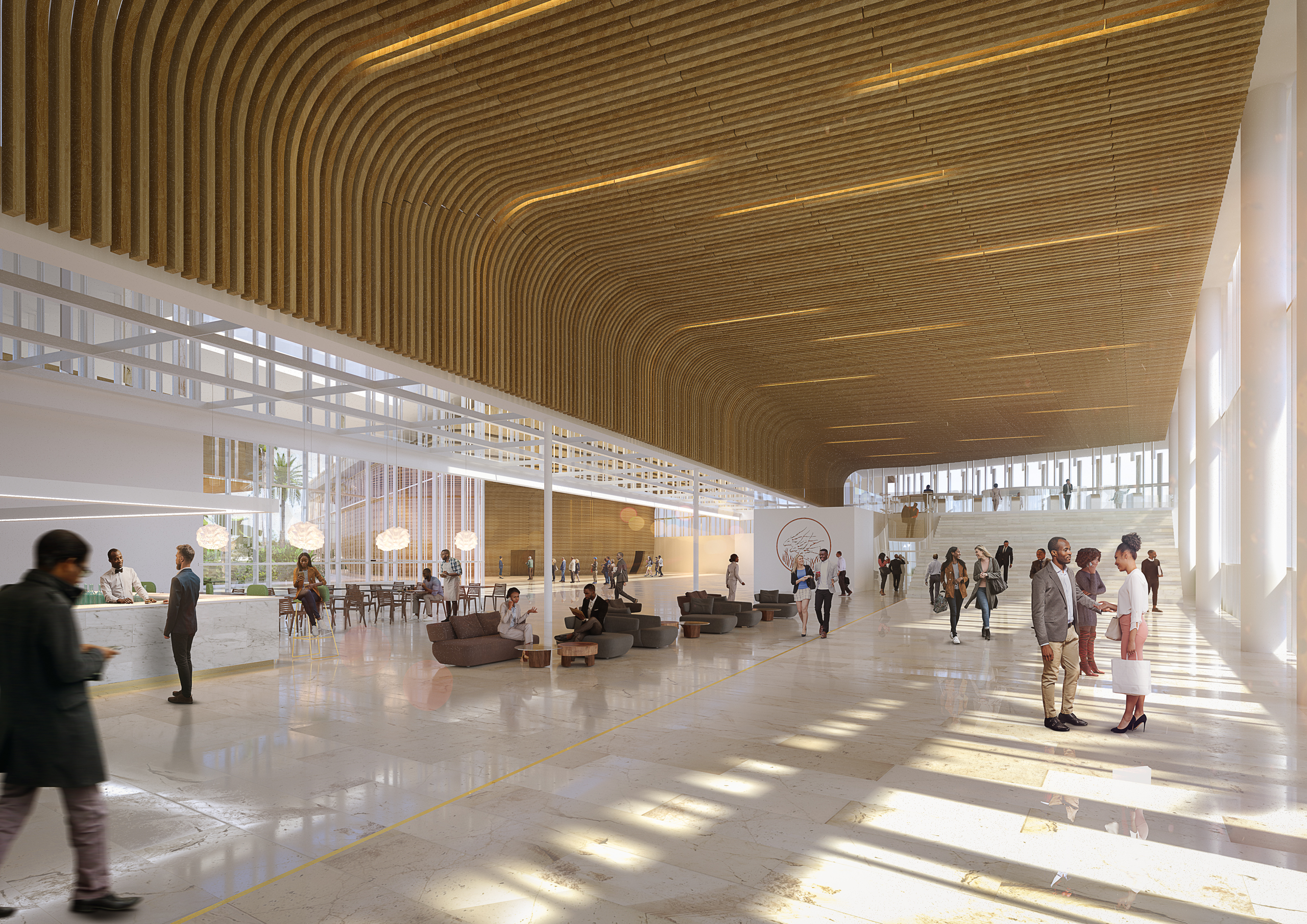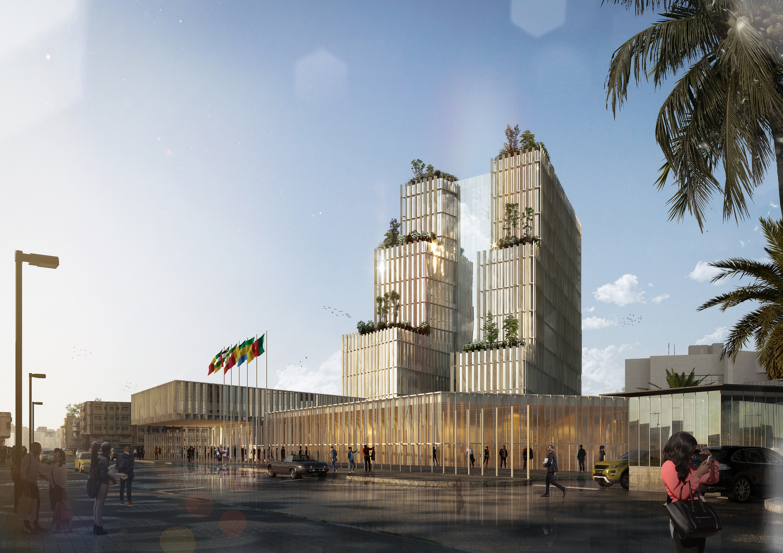 L’ensemble dessine une nouvelle entrée dans la ville de Yaoundé. Il symbolise et la croissance du pays et la puissance et la solidité de l’institution. Il s’intègre dans un tissu urbain structuré mais peu dense, regroupant des édifices tertiaires et institutionnels aux morphologies relativement libres. Le bâtiment principal dresse face au rond-point du 20 mai une tour de 12 niveaux dont la pointe arrondie, calquée sur la forme de la parcelle, renouvelle de façons contemporaine les dispositions du Flatiron Building de New York City. La tour descend progressivement vers l’Ouest sous forme de gradins paysagers, offrant de grandes terrasses végétalisées accessibles, symboles des sept collines de la ville de Yaoundé. Une enveloppe de lamelles verticales toute hauteur, alternant entre verre transparent et marbre, rappelle les 6 drapeaux des états membres de la BEAC grâce à un travail cinétique de profondeur et d’inclinaison. Entre architecture et sculpture, la double-peau offre une protection passive vis-à-vis des nuisances urbaines et climatiques de la région. Le projet présente de nombreux atouts, tant au service de la BEAC, en lui offrant de nouveaux locaux plus adaptés à ses besoins et renforçant son rôle dans la capitale, qu’au profit du Cameroun, en proposant une véritable signature architecturale inscrite au service du développement durable.